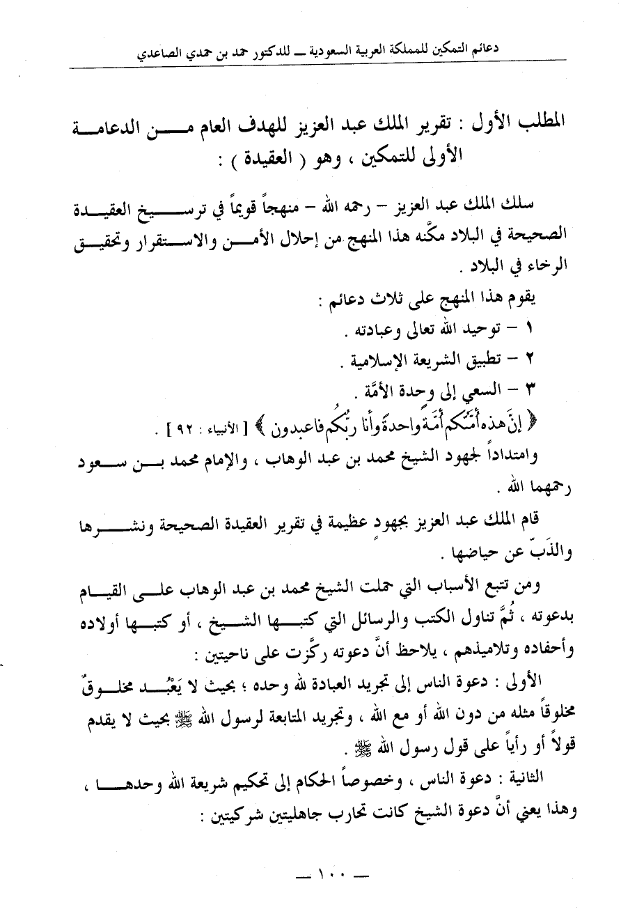 المطلب الأول: تقرير الملك عبد العزيز للهدف العام من الدعامة الأولى للتمكين، وهو (العقيدة) :