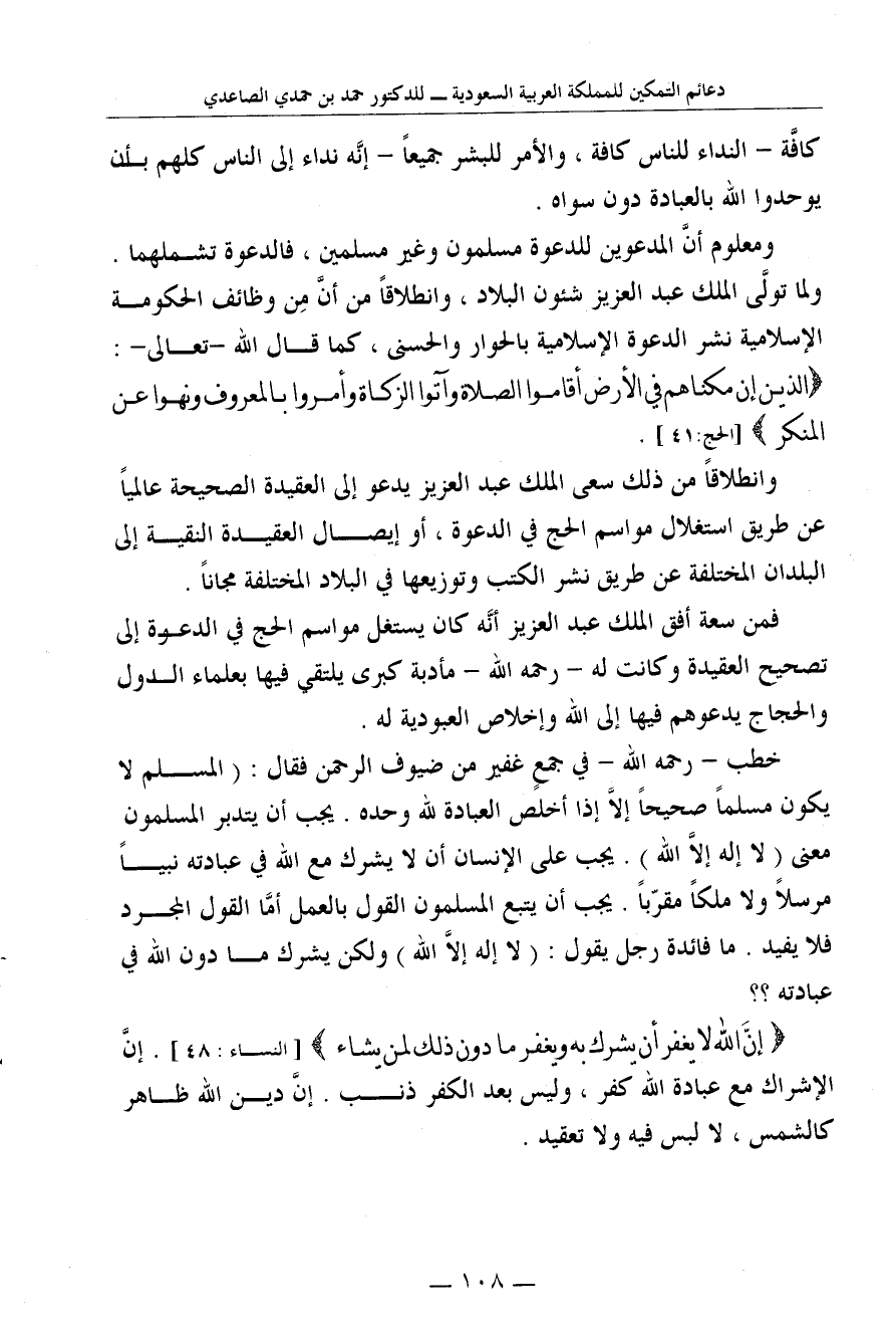 {إنَّ الله إِنَّ اللَّهَ لا يَغْفِرُ أَنْ يُشْرَكَ بِهِ وَيَغْفِرُ مَا دُونَ ذَلِكَ لِمَنْ يَشَاء} [النساء: 48] . إنَّ الإشراك مع عبادة الله كفر، وليس بعد الكفر ذنب. إنَّ دين الله ظاهر كالشمس، لا لبس فيه ولا تعقيد".