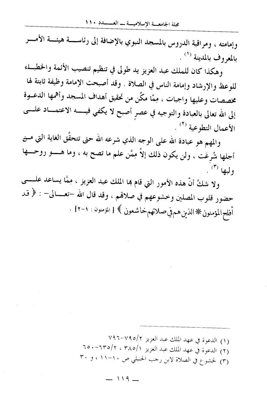وهكذا كان للملك عبد العزيز يد طولى في تنظيم تنصيب الأئمة والخطباء للوعظ والإرشاد وإمامة الناس في الصلاة. وقد أصبحت الإمامة وظيفة ثابتة لها مخصصات وعليها واجبات، مِمَّا مكَّن من تحقيق أهداف المسجد وأهمها الدعوة إلى الله تعالى بالعبادة والتوجيه في عصرٍ أصبح لا يكفي فيه الاعتماد على الأعمال التطوعية2.