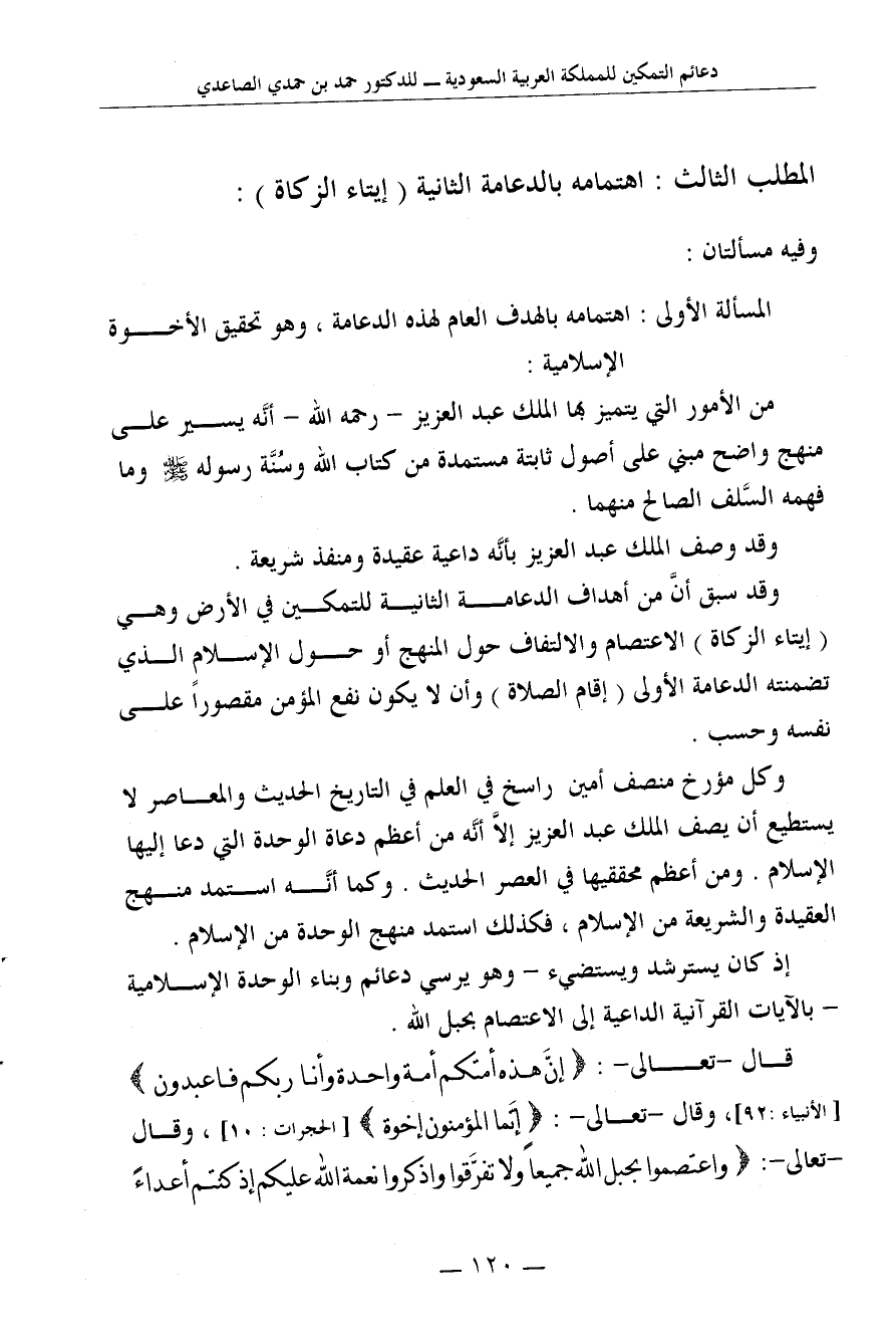 (إيتاء الزكاة) الاعتصام والالتفاف حول المنهج أو حول الإسلام الذي تضمنته الدعامة الأولى (إقام الصلاة) وأن لا يكون نفع المؤمن مقصوراً على نفسه وحسب.