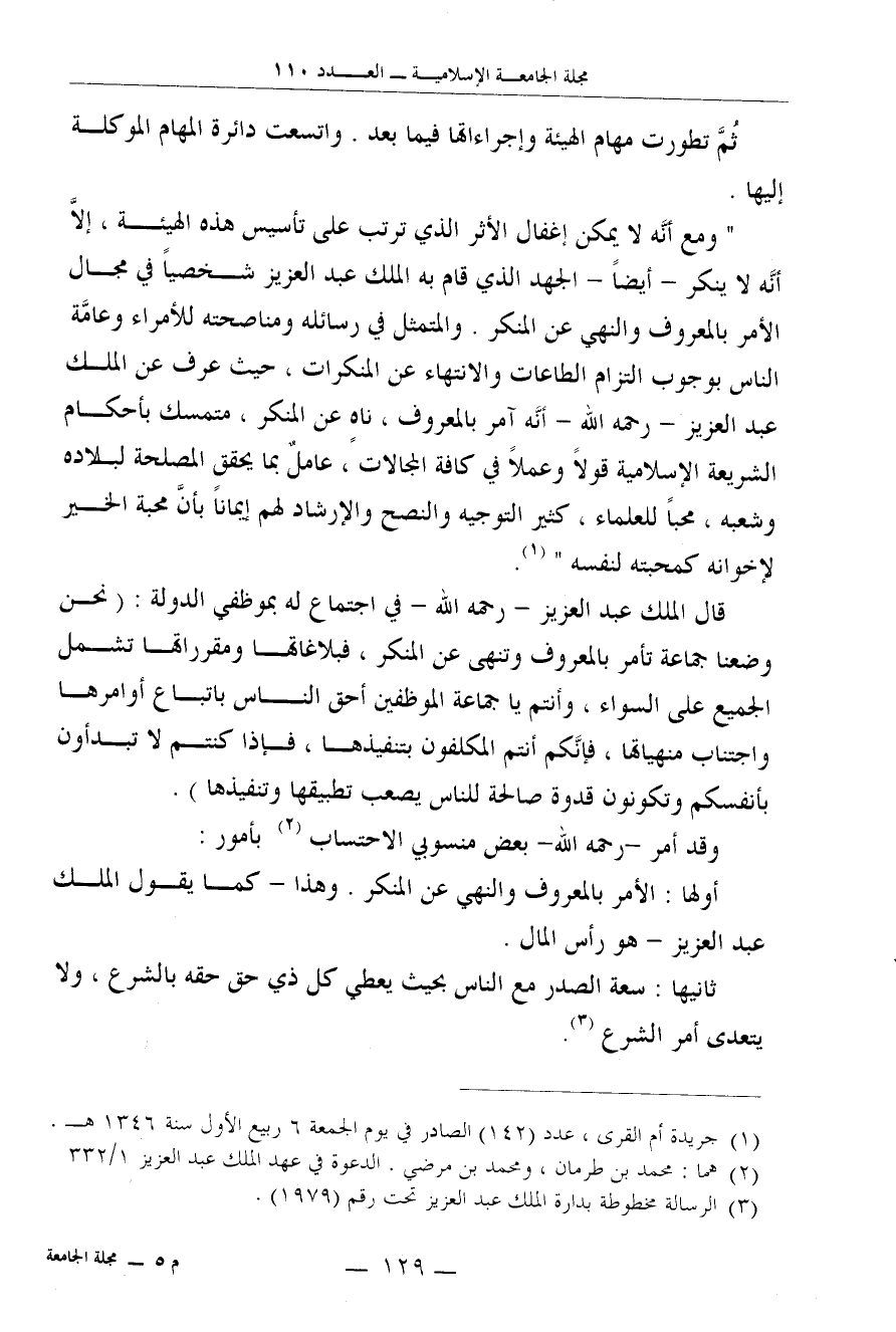 "ومع أنَّه لا يمكن إغفال الأثر الذي ترتب على تأسيس هذه الهيئة، إلاَّ أنَّه لا ينكر - أيضاً - الجهد الذي قام به الملك عبد العزيز شخصياً في مجال الأمر بالمعروف والنهي عن المنكر. والمتمثل في رسائله ومناصحته للأمراء وعامَّة الناس بوجوب التزام الطاعات والانتهاء عن المنكرات، حيث عرف عن الملك عبد العزيز - رحمه الله - أنَّه آمر بالمعروف، ناهٍ عن المنكر، متمسك بأحكام الشريعة الإسلامية قولاً وعملاً في كافة المجالات، عاملٌ بما يحقق المصلحة لبلاده وشعبه، محباً للعلماء، كثير التوجيه والنصح والإرشاد لهم إيماناً بأنَّ محبة الخير لإخوانه كمحبته لنفسه"1.
