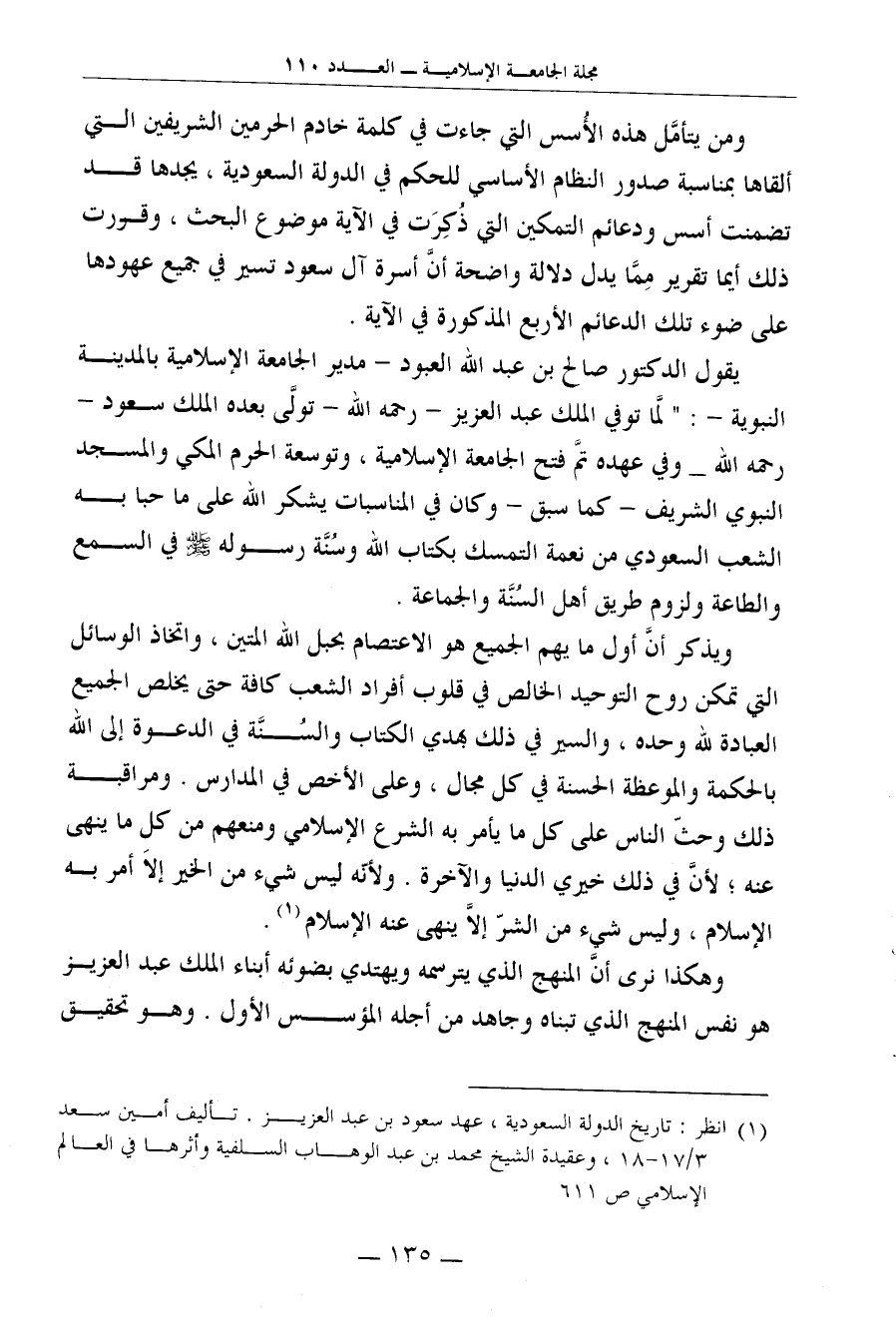 يقول الدكتور صالح بن عبد الله العبود - مدير الجامعة الإسلامية بالمدينة النبوية -: "لمَّا توفي الملك عبد العزيز - رحمه الله - تولَّى بعده الملك سعود - رحمه الله - وفي عهده تمَّ فتح الجامعة الإسلامية، وتوسعة الحرم المكي والمسجد النبوي الشريف - كما سبق - وكان في المناسبات يشكر الله على ما حبا به الشعب السعودي من نعمة التمسك بكتاب الله وسُنَّة رسوله صلى الله عليه وسلم في السمع والطاعة ولزوم طريق أهل السُنَّة والجماعة.