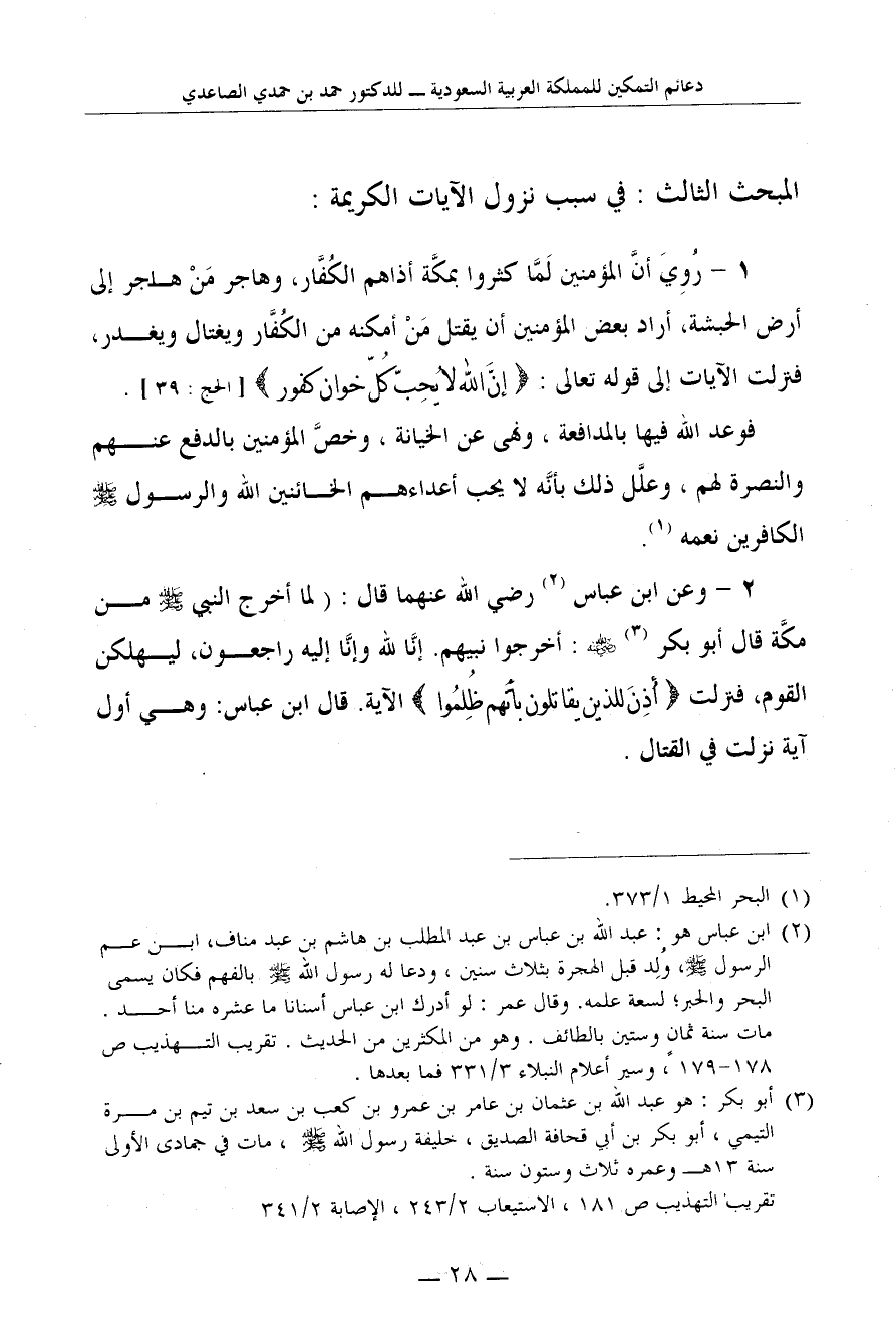 2 - وعن ابن عباس2 رضي الله عنهما قال: "لما أخرج النبي صلى الله عليه وسلم من مكَّة قال أبو بكر3 رضي الله عنه: أخرجوا نبيهم. إنَّا لله وإنَّا إليه راجعون، ليهلكن القوم، فنزلت {أُذِنَ لِلَّذِينَ يُقَاتَلُونَ بِأَنَّهُمْ ظُلِمُوا} الآية. قال ابن عباس: وهي أول آية نزلت في القتال".