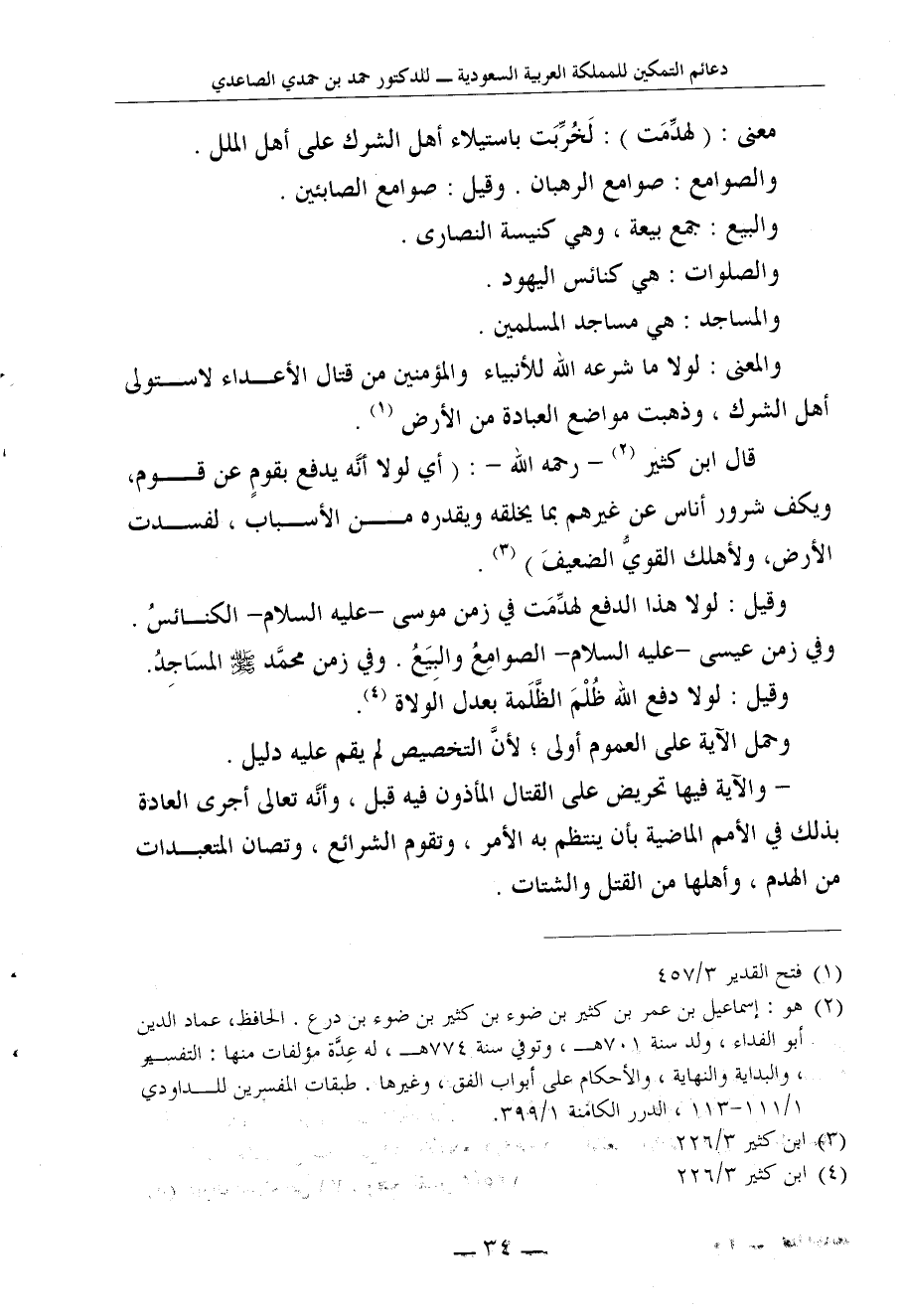 وقيل: لولا هذا الدفع لهدِّمَت في زمن موسى -عليه السلام- الكنائسُ. وفي زمن عيسى -عليه السلام- الصوامِعُ والبِيَعُ. وفي زمن محمَّد صلى الله عليه وسلم المسَاجِدُ.