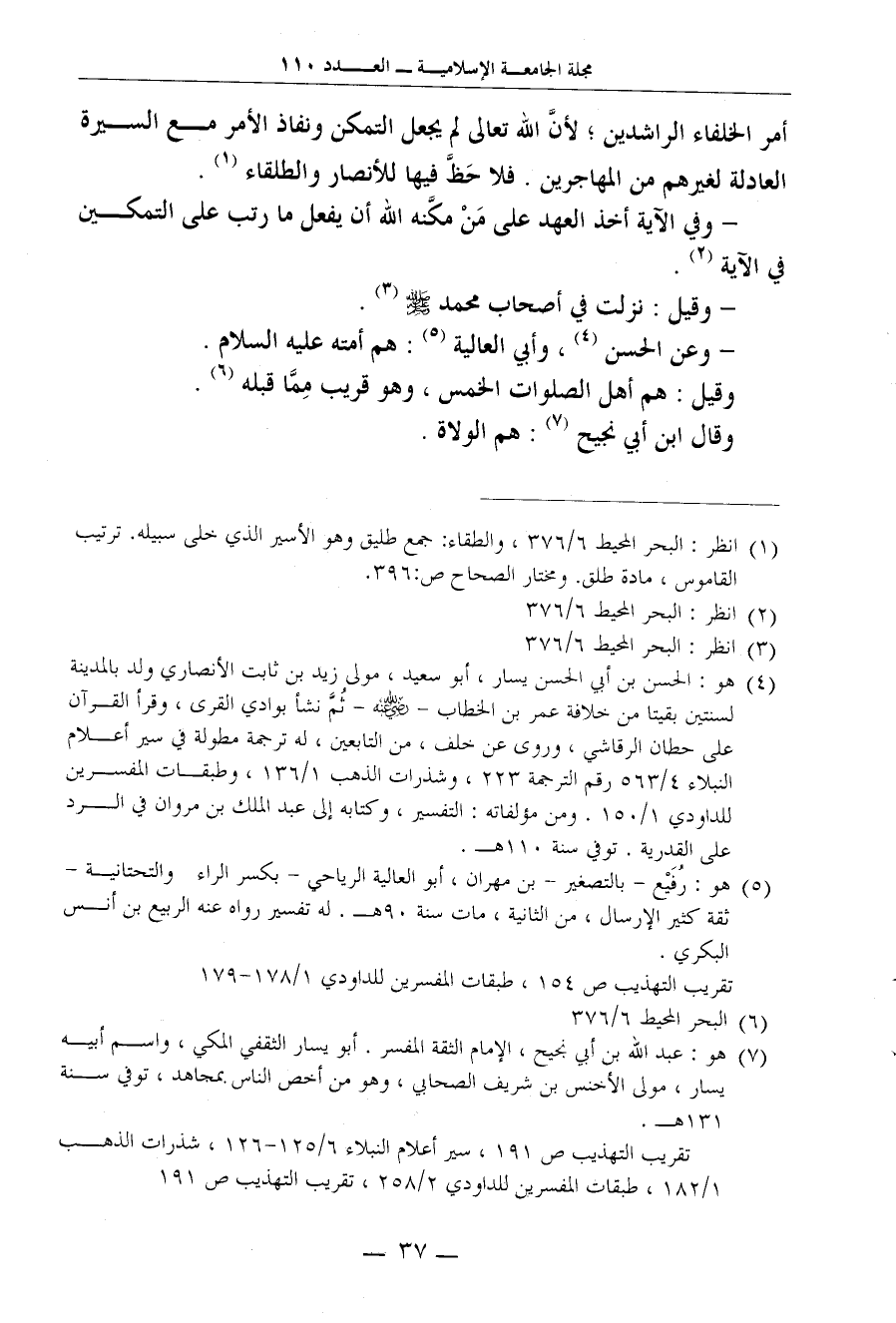 4 هو: الحسن بن أبي الحسن يسار، أبو سعيد، مولى زيد بن ثابت الأنصاري ولد بالمدينة لسنتين بقيتا من خلافة عمر بن الخطاب - رضي الله عنه - ثُمَّ نشأ بوادي القرى، وقرأ القرآن على حطان الرقاشي، وروى عن خلف، من التابعين، له ترجمة مطولة في سير أعلام النبلاء 4/563 رقم الترجمة 223، وشذرات الذهب 1/136، وطبقات المفسرين للداودي 1/150. ومن مؤلفاته: التفسير، وكتابه إلى عبد الملك بن مروان في الرد على القدرية. توفي سنة 110هـ.