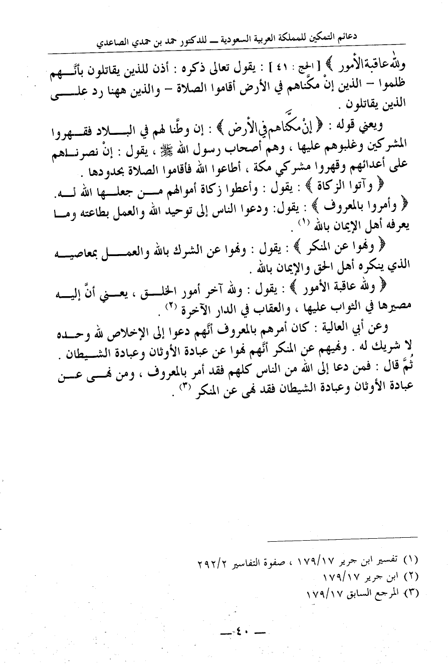 وَلِلَّهِ عَاقِبَةُ الأُمُورِ} [الحج: 41] : "يقول تعالى ذكره: أذن للذين يقاتلون بأنَّهم ظلموا - الذين إنْ مكَّناهم في الأرض أقاموا الصلاة - والذين ههنا رد على الذين يقاتلون.