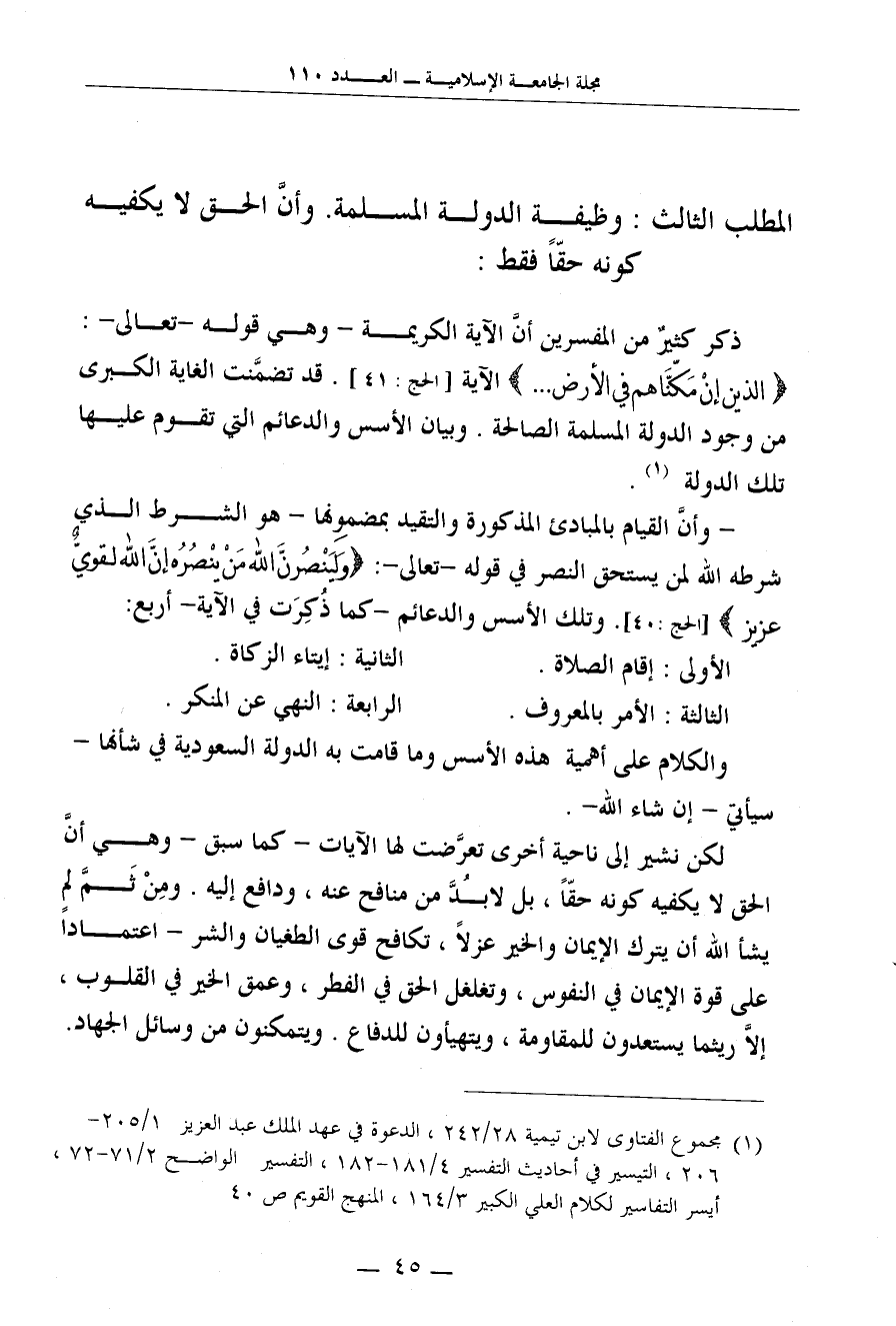 {الَّذِينَ إِنْ مَكَّنَّاهُمْ فِي الأَرْضِ…} الآية [الحج: 41] . قد تضمَّنت الغاية الكبرى من وجود الدولة المسلمة الصالحة. وبيان الأسس والدعائم التي تقوم عليها تلك الدولة1.