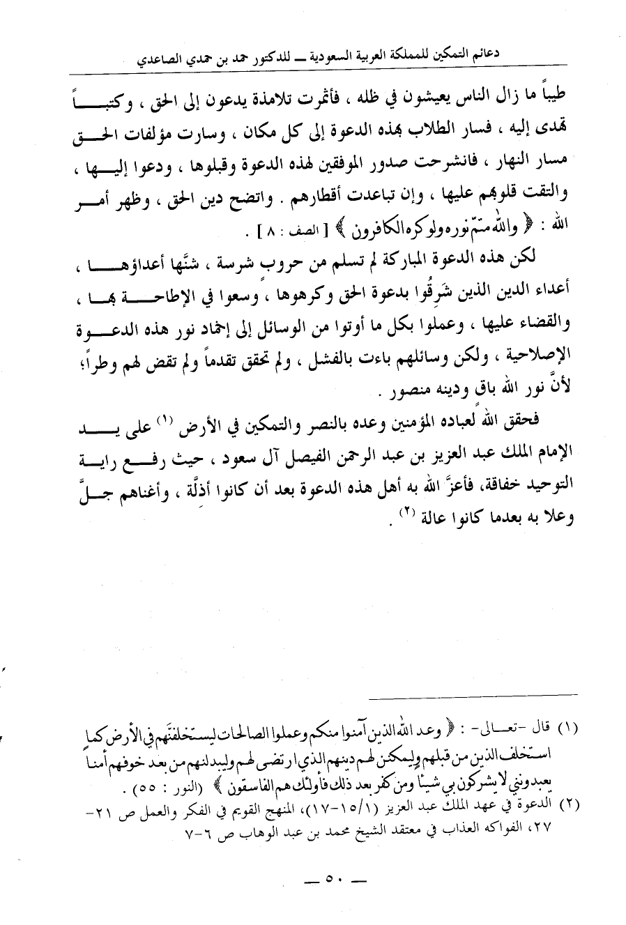 طيباً ما زال الناس يعيشون في ظله، فأثمرت تلامذة يدعون إلى الحق، وكتباً تهدى إليه، فسار الطلاب بهذه الدعوة إلى كل مكان، وسارت مؤلفات الحق مسار النهار، فانشرحت صدور الموفقين لهذه الدعوة وقبلوها، ودعوا إليها، والتقت قلوبهم عليها، وإن تباعدت أقطارهم. واتضح دين الحق، وظهر أمر الله: {وَاللَّهُ مُتِمُّ نُورِهِ وَلَوْ كَرِهَ الْكَافِرُونَ} [الصف: 8] .