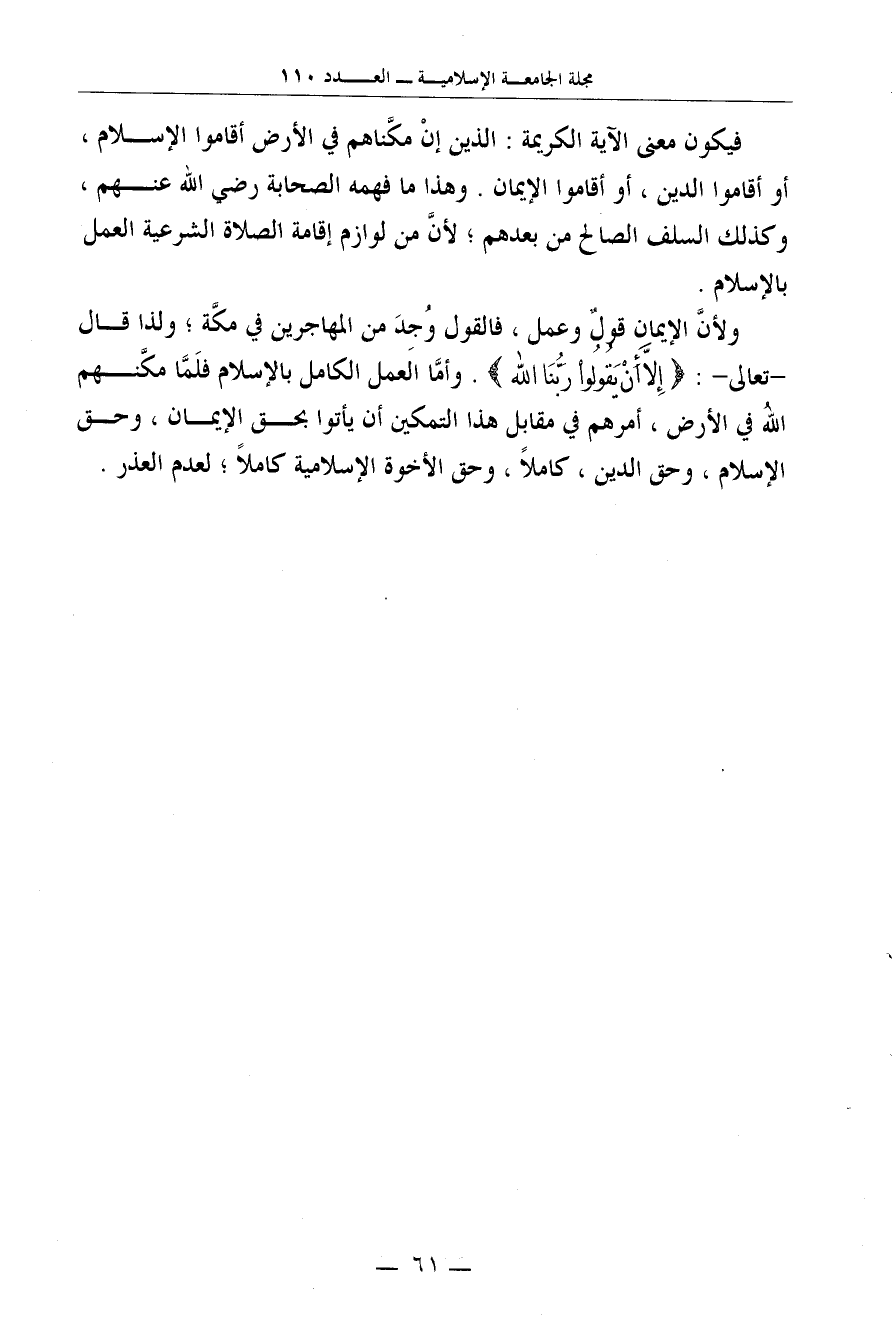 ولأنَّ الإيمان قولٌ وعمل، فالقول وُجِدَ من المهاجرين في مكَّة؛ ولذا قال -تعالى-: {إِلاَّ أَنْ يَقُولُواْ رَبُّنَا الله} . وأمَّا العمل الكامل بالإسلام فلَمَّا مكَّنهم اللهُ في الأرض، أمرهم في مقابل هذا التمكين أن يأتوا بحق الإيمان، وحق الإسلام، وحق الدين كاملاً، وحق الأخوة الإسلامية كاملاً؛ لعدم العذر.