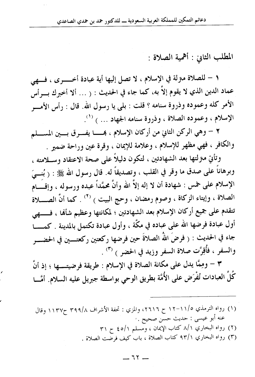 1 - للصلاة منزلة في الإسلام، لا تصل إليها أية عبادة أخرى، فهي عماد الدين الذي لا يقوم إلاَّ به، كما جاء في الحديث: " ... ألا أخبرك برأس الأمر كله وعموده وذروة سنامه؟ " قلت: "بلى يا رسول الله". قال: "رأس الأمر الإسلام، وعموده الصلاة، وذروة سنامه الجهاد ... " 1.