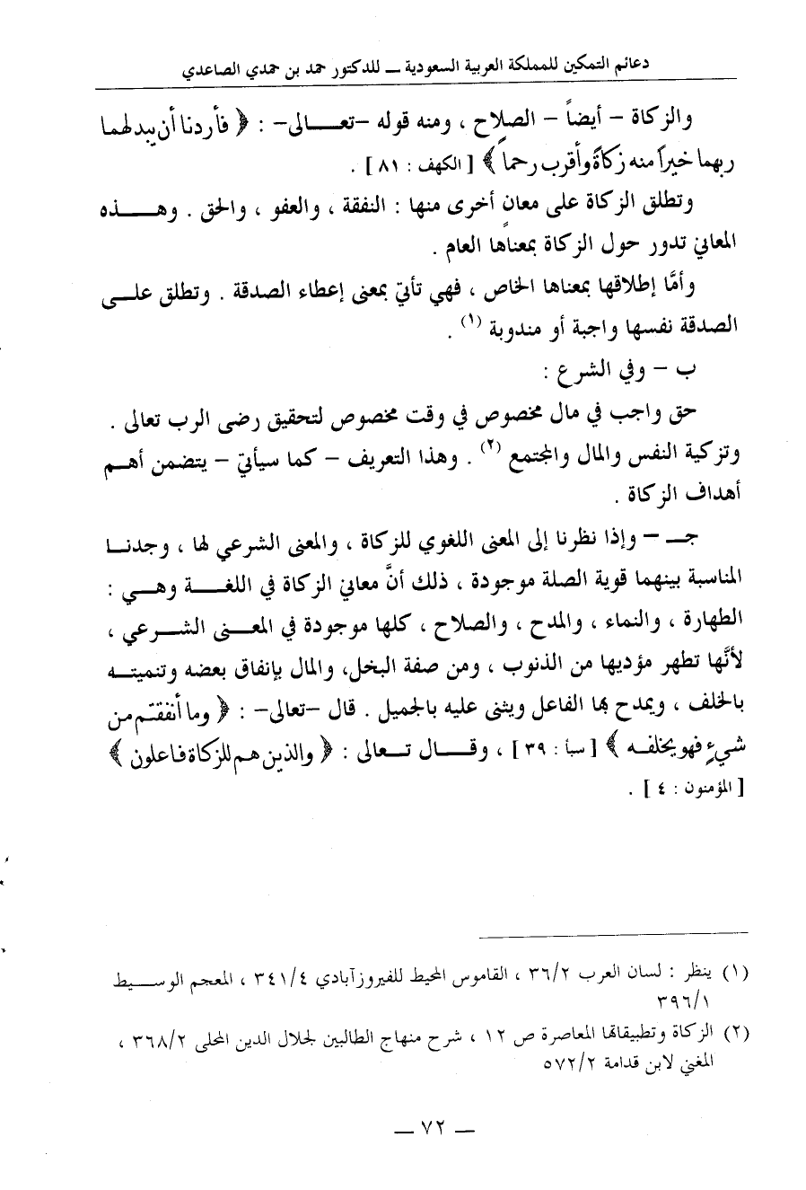 جـ – وإذا نظرنا إلى المعنى اللغوي للزكاة، والمعنى الشرعي لها، وجدنا المناسبة بينهما قوية الصلة موجودة، ذلك أنَّ معاني الزكاة في اللغة وهي: الطهارة، والنماء، والمدح، والصلاح، كلها موجودة في المعنى الشرعي، لأنَّها تطهر مؤديها من الذنوب، ومن صفة البخل، والمال بإنفاق بعضه وتنميته بالخلف، ويمدح بها الفاعل ويثنى عليه بالجميل. قال -تعالى-: {وَمَا أَنْفَقْتُمْ مِنْ شَيْءٍ فَهُوَ يُخْلِفُهُ} [سبأ: 39] ، وقال تعالى: {وَالَّذِينَ هُمْ لِلزَّكَاةِ فَاعِلُونَ} [المؤمنون: 4] .