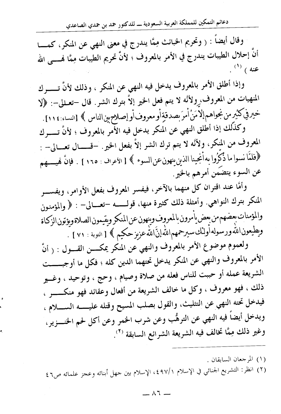 وكذلك إذا أطلق النهي عن المنكر يدخل فيه الأمر بالمعروف؛ لأنَّ ترك المعروف من المنكر، ولأنَّه لا يتم ترك الشر إلاَّ بفعل الخير. -قال تعالى-: {فَلَمَّا نَسُوا مَا ذُكِّرُوا بِهِ أَنْجَيْنَا الَّذِينَ يَنْهَوْنَ عَنِ السُّوءِ} [الأعراف: 165] . فإنَّ نهيهم عن السوء يتضمن أمرهم بالخير.