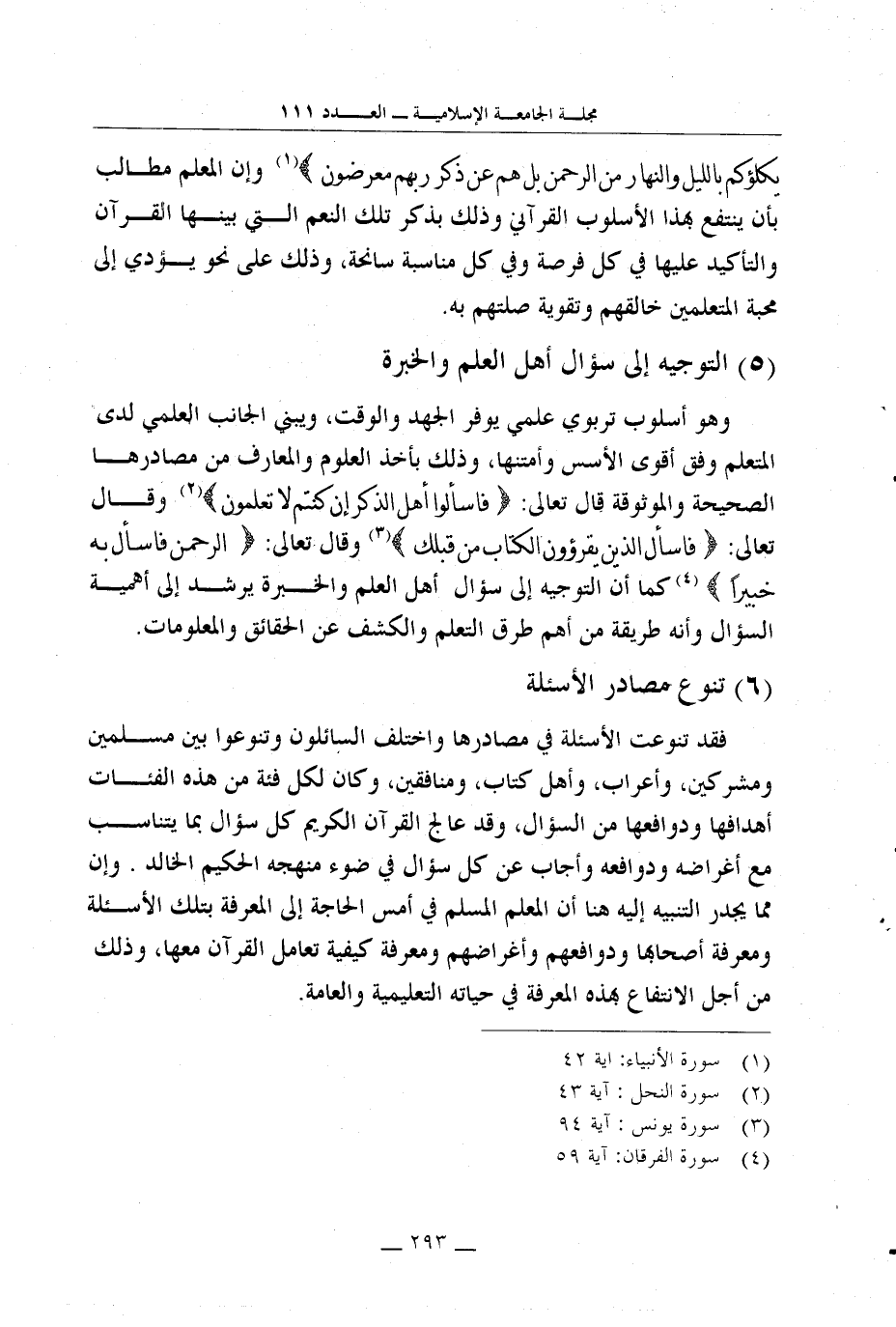 وهو أسلوب تربوي علمي يوفر الجهد والوقت، ويبني الجانب العلمي لدى المتعلم وفق أقوى الأسس وأمتنها، وذلك بأخذ العلوم والمعارف من مصادرها الصحيحة والموثوقة قال تعالى: {فَاسْأَلوا أَهْلَ الذِّكْرِ إِنْ كُنْتُمْ لا تَعْلَمُونَ} 2 وقال تعالى: {فَاسْأَلِ الَّذِينَ يَقْرَأُونَ الْكِتَابَ مِنْ قَبْلِكَ} 3 وقال تعالى: {الرَّحْمَنُ فَاسْأَلْ بِهِ خَبِيراً} 4 كما أن التوجيه إلى سؤال أهل العلم والخبرة يرشد إلى أهمية السؤال وأنه طريقة من أهم طرق التعلم والكشف عن الحقائق والمعلومات.