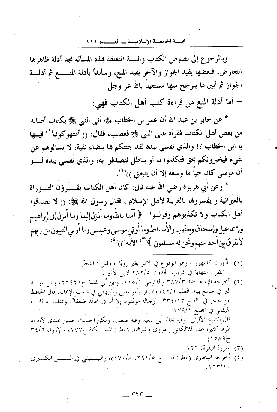 - عن جابر بن عبد الله أن عمر بن الخطاب رضي الله عنه أتى النبي صلى الله عليه وسلم بكتاب أصابه من بعض أهل الكتاب فقرأه على النبي صلى الله عليه وسلم فغضب، فقال: "أمتهوكون1 فيها يا ابن الخطاب؟! والذي نفسي بيده لقد جئتكم بها بيضاء نقية، لا تسألوهم عن شيء فيخبرونكم بحق فتكذبوا به أو بباطل فتصدقوا به، والذي نفسي بيده لو أن موسى كان حياً ما وسعه إلا أن يتبعني" 2.