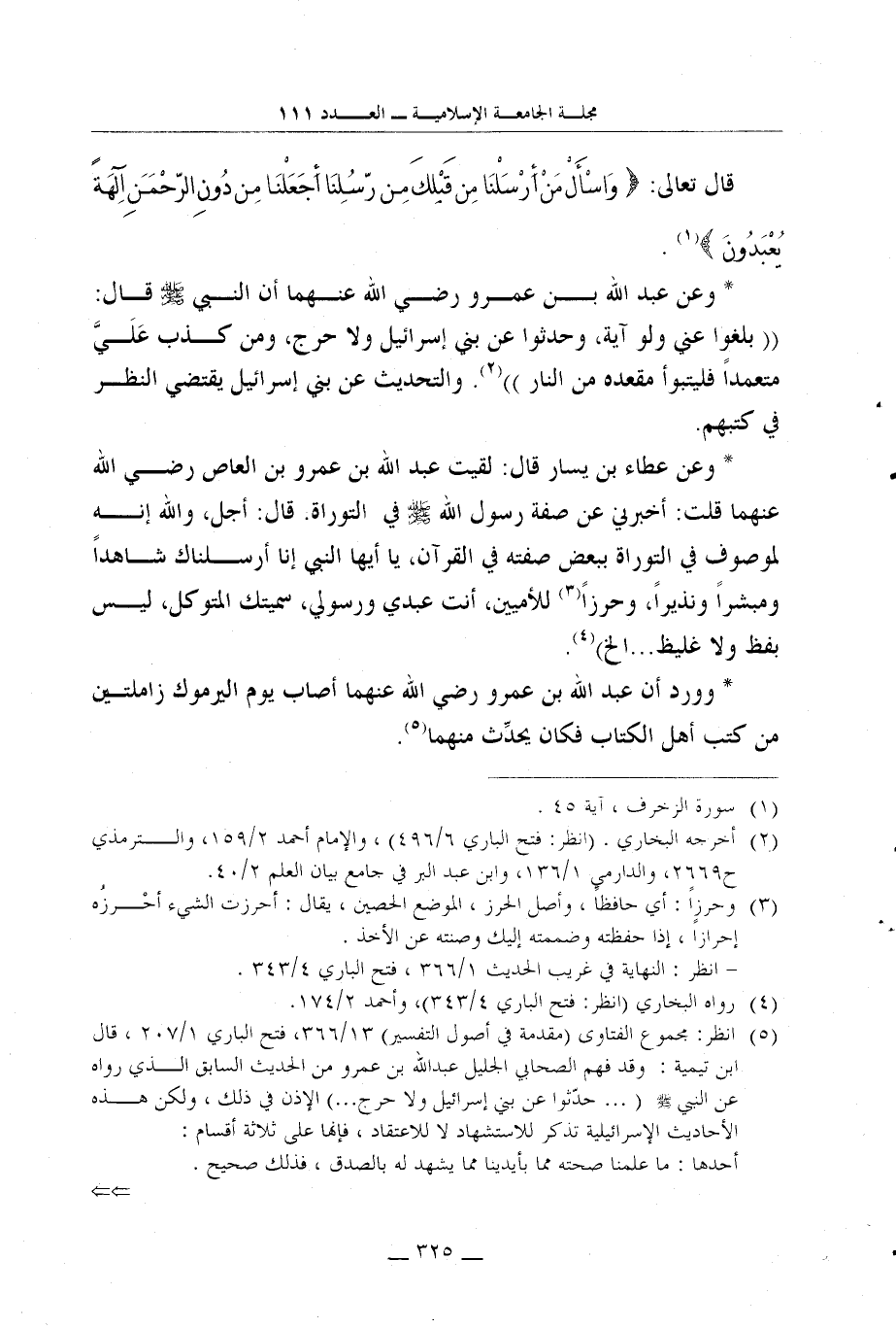 5 انظر: مجموع الفتاوى (مقدمة في أصول التفسير) 13/366، فتح الباري 1/207، قال ابن تيمية: وقد فهم الصحابي الجليل عبد الله بن عمرو من الحديث السابق الذي رواه عن النبي صلى الله عليه وسلم: " ... حدّثوا عن بني إسرائيل ولا حرج ... " الإذن في ذلك، ولكن هذه الأحاديث الإسرائيلية تذكر للاستشهاد لا للاعتقاد، فإنها على ثلاثة أقسام: