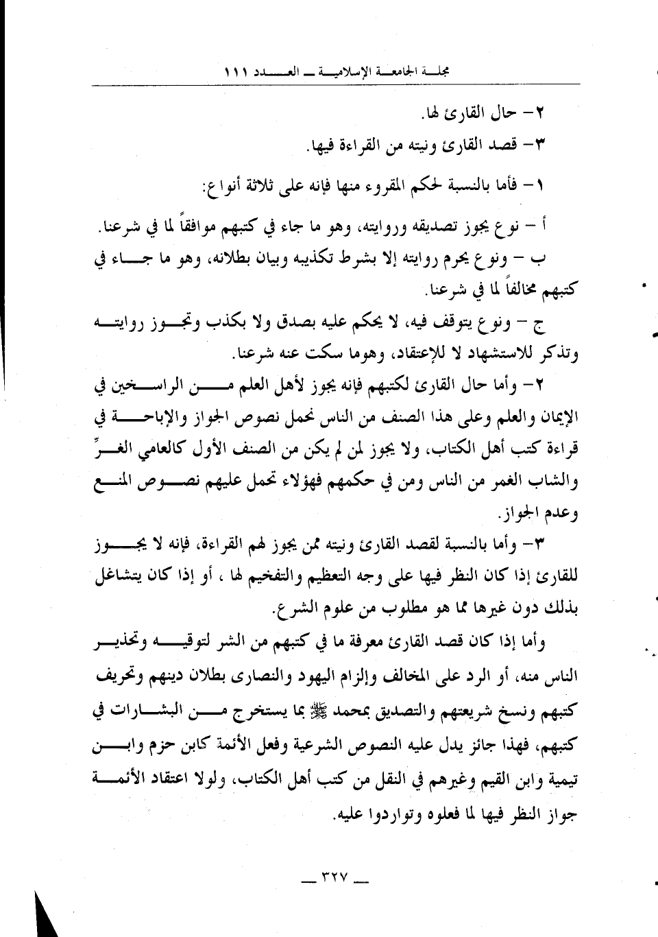 2- وأما حال القارئ لكتبهم فإنه يجوز لأهل العلم من الراسخين في الإيمان والعلم وعلى هذا الصنف من الناس نحمل نصوص الجواز والإباحة في قراءة كتب أهل الكتاب، ولا يجوز لمن لم يكن من الصنف الأول كالعامي الغرِّ والشاب الغمر من الناس ومن في حكمهم فهؤلاء تحمل عليهم نصوص المنع وعدم الجواز.