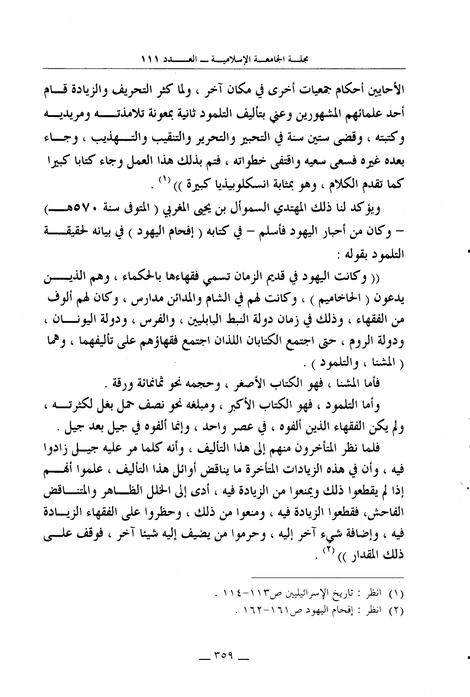 الأحايين أحكام جمعيات أخرى في مكان آخر، ولما كثر التحريف والزيادة قام أحد علمائهم المشهورين وعني بتأليف التلمود ثانية بمعونة تلامذته ومريديه وكتبته، وقضى ستين سنة في التحبير والتحرير والتنقيب والتهذيب، وجاء بعده غيره فسعى سعيه واقتفى خطواته، فتمّ بذلك هذا العمل وجاء كتاباً كبيراً كما تقدم الكلام، وهو بمثابة انسكلوبيذيا كبيرة"1.