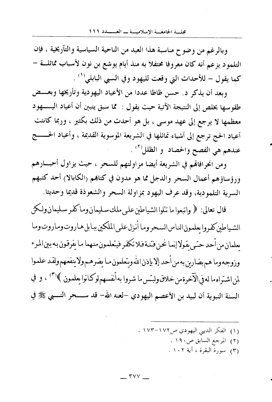 وبعد أن يذكر د. حسن ظاظا عدداً من الأعياد اليهودية وتأريخها وبعض طقوسها يخلص إلى النتيجة الآتية حيث يقول: مما سبق يتبين أن أعياد اليهود معظمها لا يرجع إلى عهد موسى، بل هو أحدث من ذلك بكثير، وربما كانت أعياد الحج ترجع إلى أشياء تماثلها في الشريعة الموسوية القديمة، وأعياد الحج عندهم هي الفصح والحصاد والظلل2.