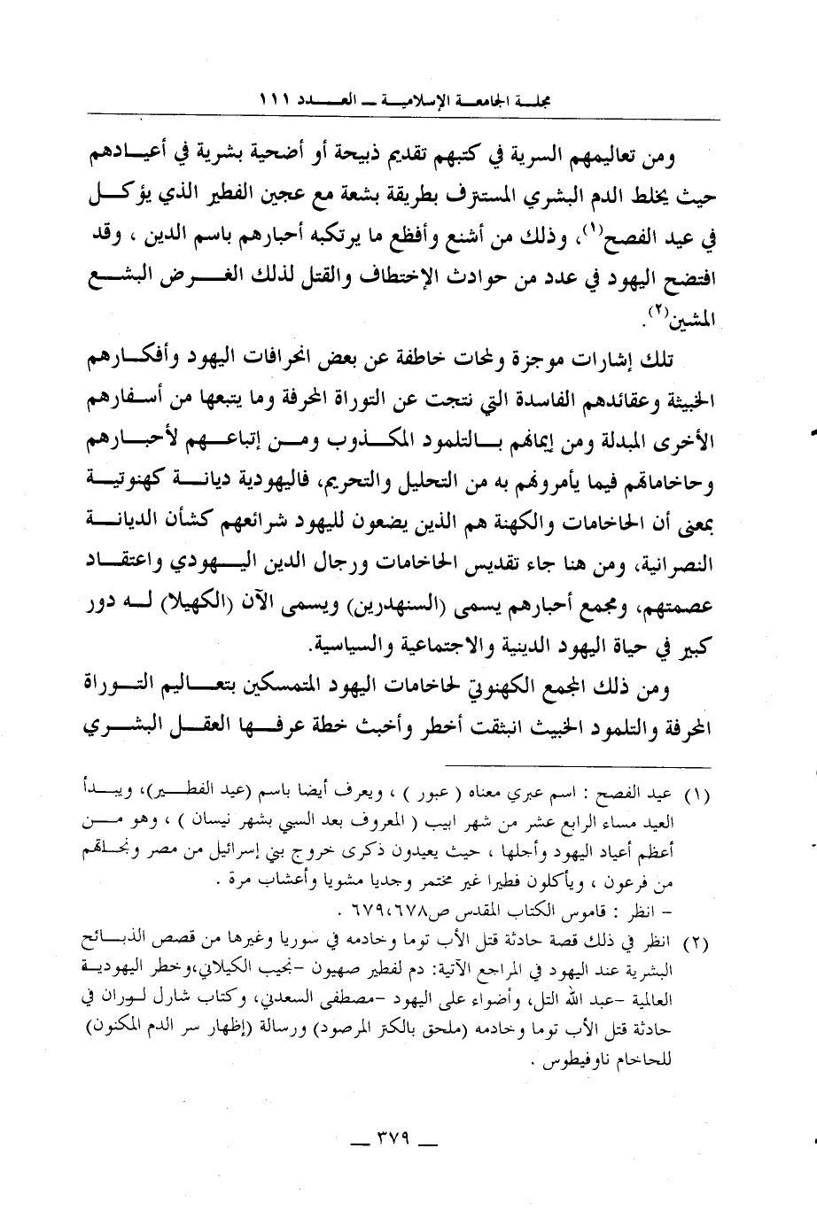 2 انظر في ذلك قصة حادثة قتل الأب توما وخادمه في سوريا وغيرها من قصص الذبائح البشرية عند اليهود في المراجع الآتية: دم لفطير صهيون - نجيب الكيلاني، وخطر اليهودية العالمية - عبد الله التل، وأضواء على اليهود - مصطفى السعدني، وكتاب شارل لوران في حادثة قتل الأب توما وخادمه (ملحق بالكنز المرصود) ورسالة (إظهار سِرِّ الدم المكنون) للحاخام ناوفيطوس.