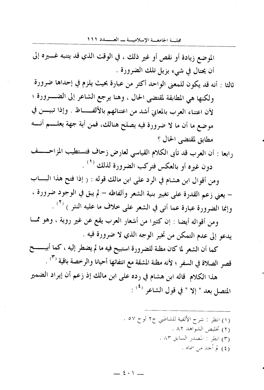 ومن أقوال ابن هشام في الرد على ابن مالك قوله: "إذا فُتح هذا الباب - يعني زعم القدرة على تغيير بنية الشعر وألفاظه - لم يبق في الوجود ضرورة، وإنما الضرورة عبارة عما أتى في الشعر على خلاف ما عليه النثر"2.