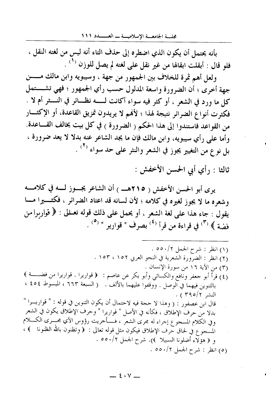 يرى أبو الحسن الأخفش (215هـ) أن الشاعر يجوز له في كلامه وشعره ما لا يجوز لغيره في كلامه؛ لأن لسانه قد اعتاد الضرائر، فكثيراً ما يقول: جاء هذا على لغة الشعر، أو يحمل على ذلك قوله تعالى: {قَوارِيراً مِنْ فِضَّةٍ} 1في قراءة من قرأ2 بصرف "قوارير"3.