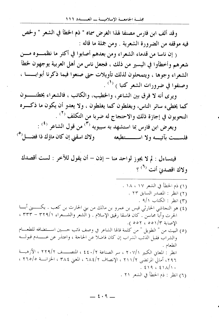 وقد ألف ابن فارس مصنفاً لهذا الغرض سمَّاه "ذمُّ الخطأ في الشعر" ولخَّص فيه موقفه من الضرورة الشعرية. ومن جملة ما قاله: