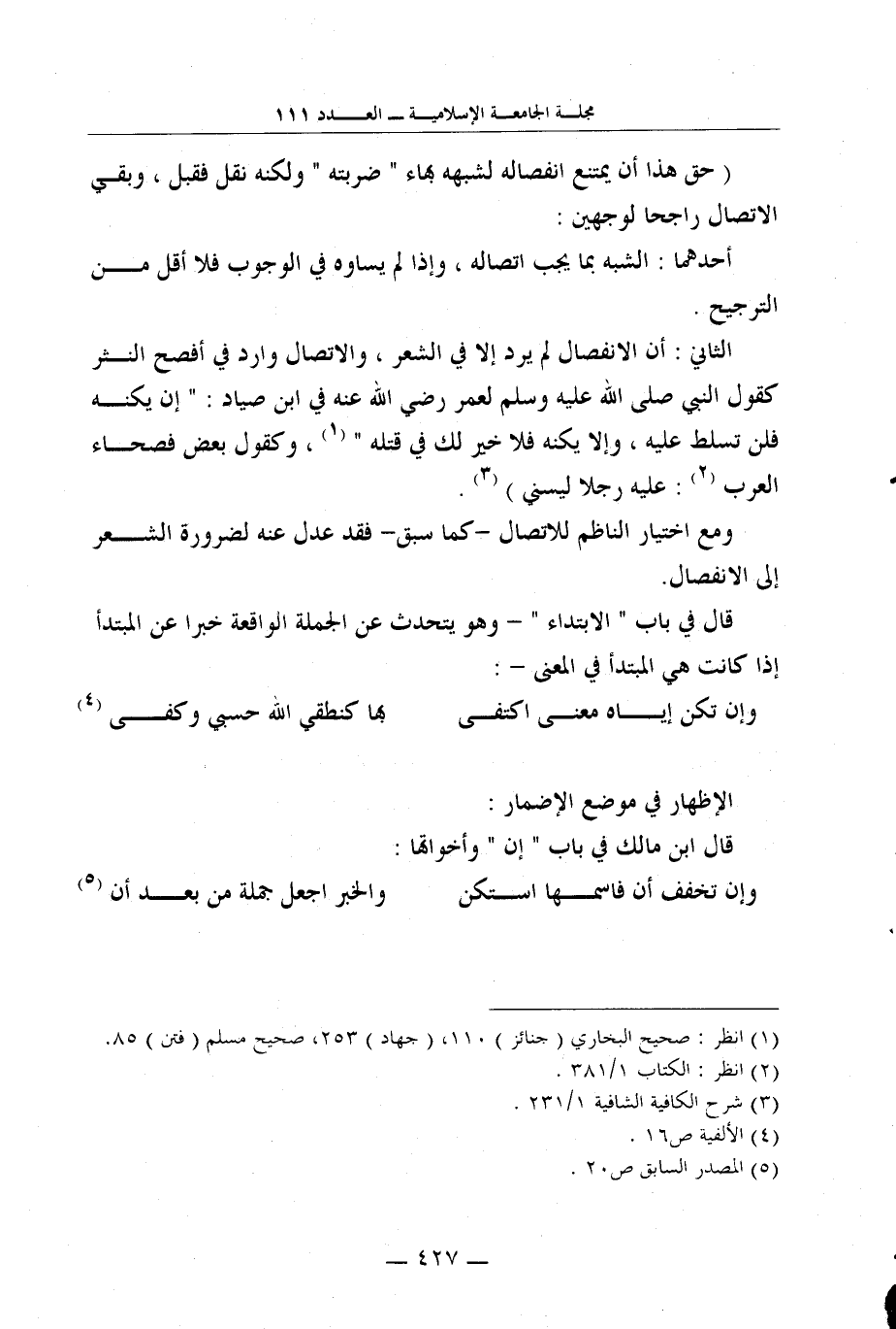 الثاني: أن الانفصال لم يرد إلاَّ في الشعر، والاتصال وارد في أفصح النثر كقول النبي صلى الله عليه وسلم لعمر رضي الله عنه في ابن صياد: "إن يكنه فلن تسلط عليه، وإلاَّ يكنه فلا خير لك في قتله" 1، وكقول بعض فصحاء العرب2: "عليه رجلاً ليسني"3.