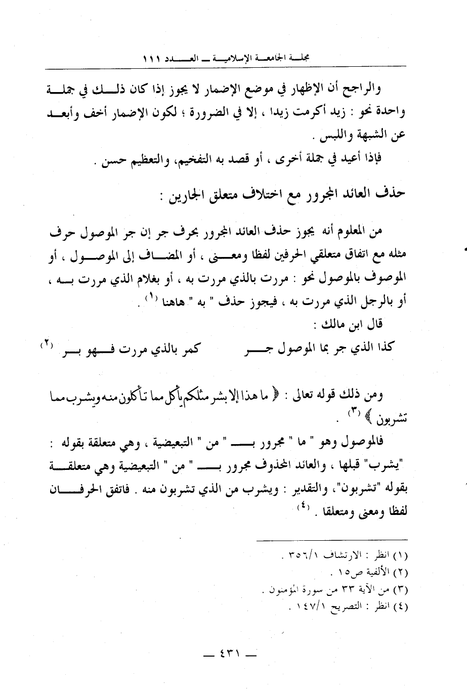 فالموصول وهو "ما" مجرور بـ"مِنْ" التبعيضية، وهي متعلقة بقوله: "يشرب" قبلها، والعائد المحذوف مجرور بـ"مِنْ" التبعيضية وهي متعلقة بقوله "تشربون"، والتقدير: ويشرب من الذي تشربون منه. فاتفق الحرفان لفظاً ومعنى ومتعلقاً4.