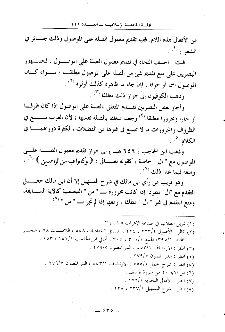 وذهب ابن الحاجب (646هـ) إلى جواز تقديم معمول الصلة على الموصول مع "أل" خاصة، كقوله تعالى: {وَكانُوا فِيهِ مِنَ الزَّاهِدينَ} 6، ومنعه فيما عدا ذلك7.