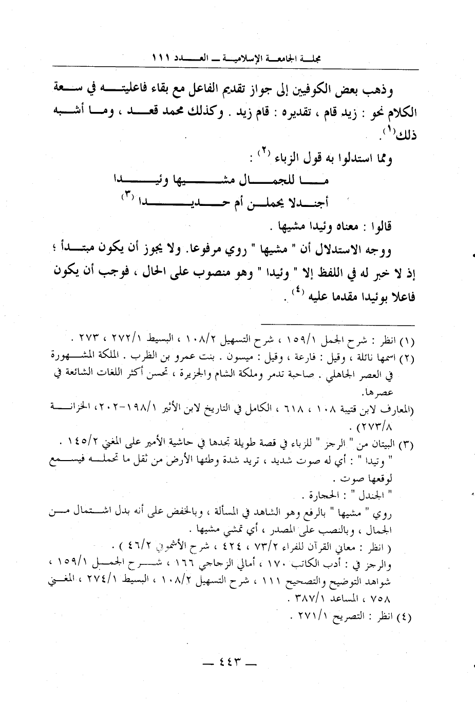 ووجه الاستدلال أن "مشيها" روي مرفوعاً. ولا يجوز أن يكون مبتدأ، إذ لا خبر له في اللفظ إلا "وئيدا" وهو منصوب على الحال، فوجب أن يكون فاعلاً بوئيدا مقدماً عليه4.