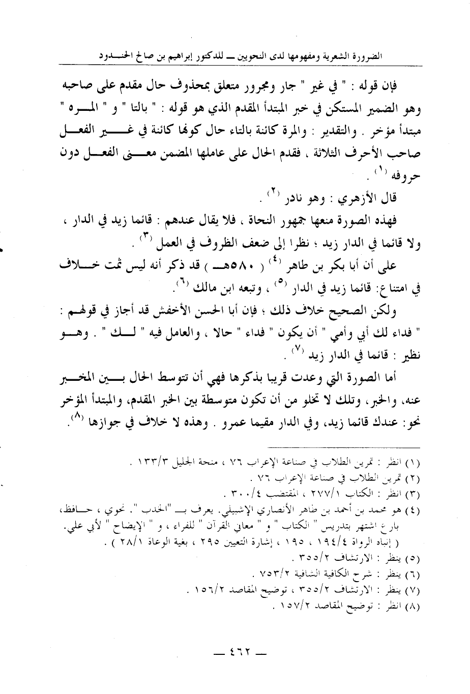 على أن أبا بكر بن طاهر4 (580هـ) قد ذكَر أنه ليس ثمت خلاف في امتناع: قائماً زيدٌ في الدار5، وتبعه ابن مالك6.
