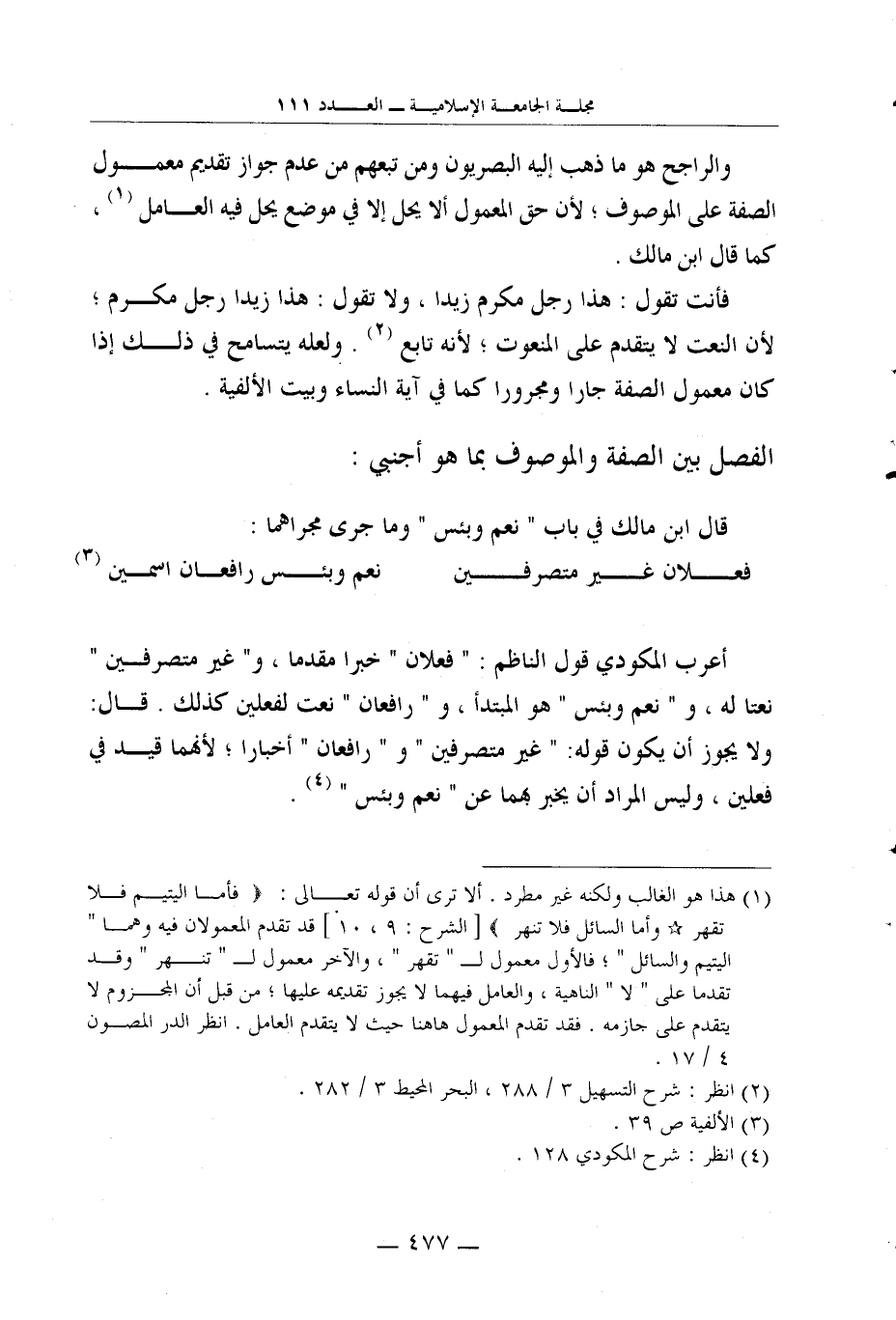 فأنت تقول: هذا رجلٌ مكرمٌ زيداً، ولا تقول: هذا زيداً رجلٌ مكرمٌ؛ لأن النعت لا يتقدم على المنعوت؛ لأنه تابع2. ولعله يُتسامح في ذلك إذا كان معمولُ الصفة جاراً ومجروراً كما في آية النساء وبيت الألفية.