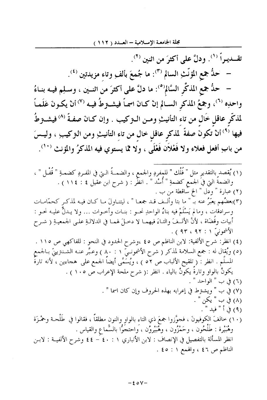 - حدُّ جمعِ المذكَّرِ السَّالمِ5: ما دلَّ على أكثرَ من اثنين، وسلِم فيه بناءُ واحدِه6، وجمعُ المذكرِ السالم إنْ كانَ اسماً فيشترطُ فيه7 أنْ يكونَ عَلَماً لمذكّرٍ عاقلٍ خَالٍ من تاءِ التأنيثِ ومن التركيب. وإن كانَ صفةً8 فيشترطُ فيها9 أنْ تكونَ صفةً لمذكرٍ عاقلٍ خالٍ من تاءِ التأنيثِ ومن التركيبِ، وليسَ من بابِ أفعل فعلاء ولا فَعْلاَن فَعْلَى، ولا ممّا يستوي فيه المذكرُ والمؤنث10.