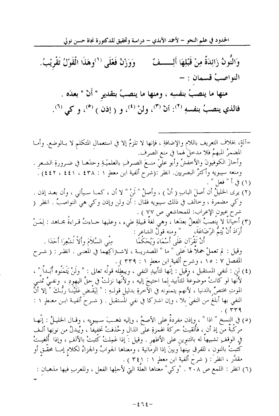 2 يرى الخليلُ أن أصلَ البابِ "أنْ"، وأصلُ "لَنْ" لا أن، كما سيأتي، وأن بعد إذن. وكي مضمرة، وخالف في ذلك سيبويه فقال: "أن ولن وإذن وكي هي النواصبُ". انظر: (شرح عيون الإعراب: للمجاشعي ص 77) .