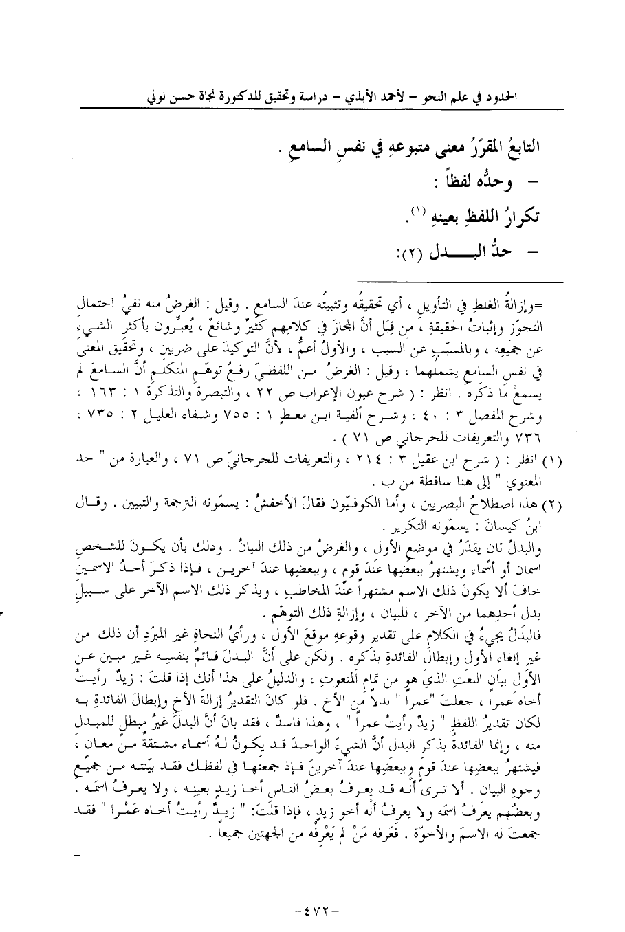 2 هذا اصطلاحُ البصريين، وأما الكوفيّون فقالَ الأخفشُ: "يسمّونه الترجمة والتبيين". وقال ابنُ كيسانَ: "يسمّونه التكرير".