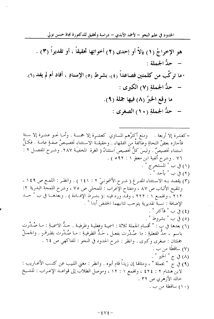 3 يقصد به الاستثناء المفرغ (شرح الأشمونيّ 2: 141) . وانظر: اللمع ص 149، وتلقيح الألباب ص 87، ومفتاح الإعراب: للمحلي ص 75، وشرح اللمحة البدرية 2: 212، والهمع 1: 222، وقد ورد فيه: "بشرط الإفادة". وبعدها في ب "حد الإضافة: نسبة تقديرية يتوجب لثانيهما الخفض أبدا".