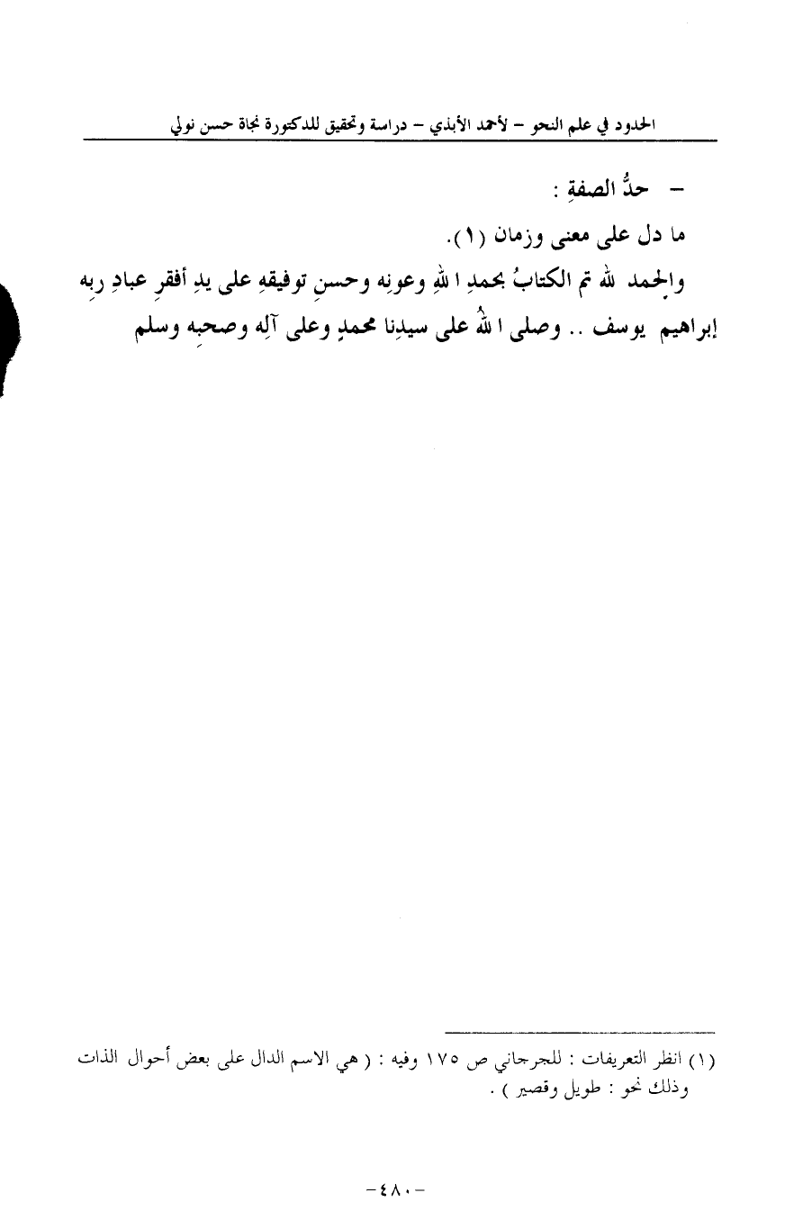 1 انظر التعريفات: (للجرجاني ص 175 وفيه: "هي الاسم الدال على بعض أحوال الذات وذلك نحو: طويل وقصير".