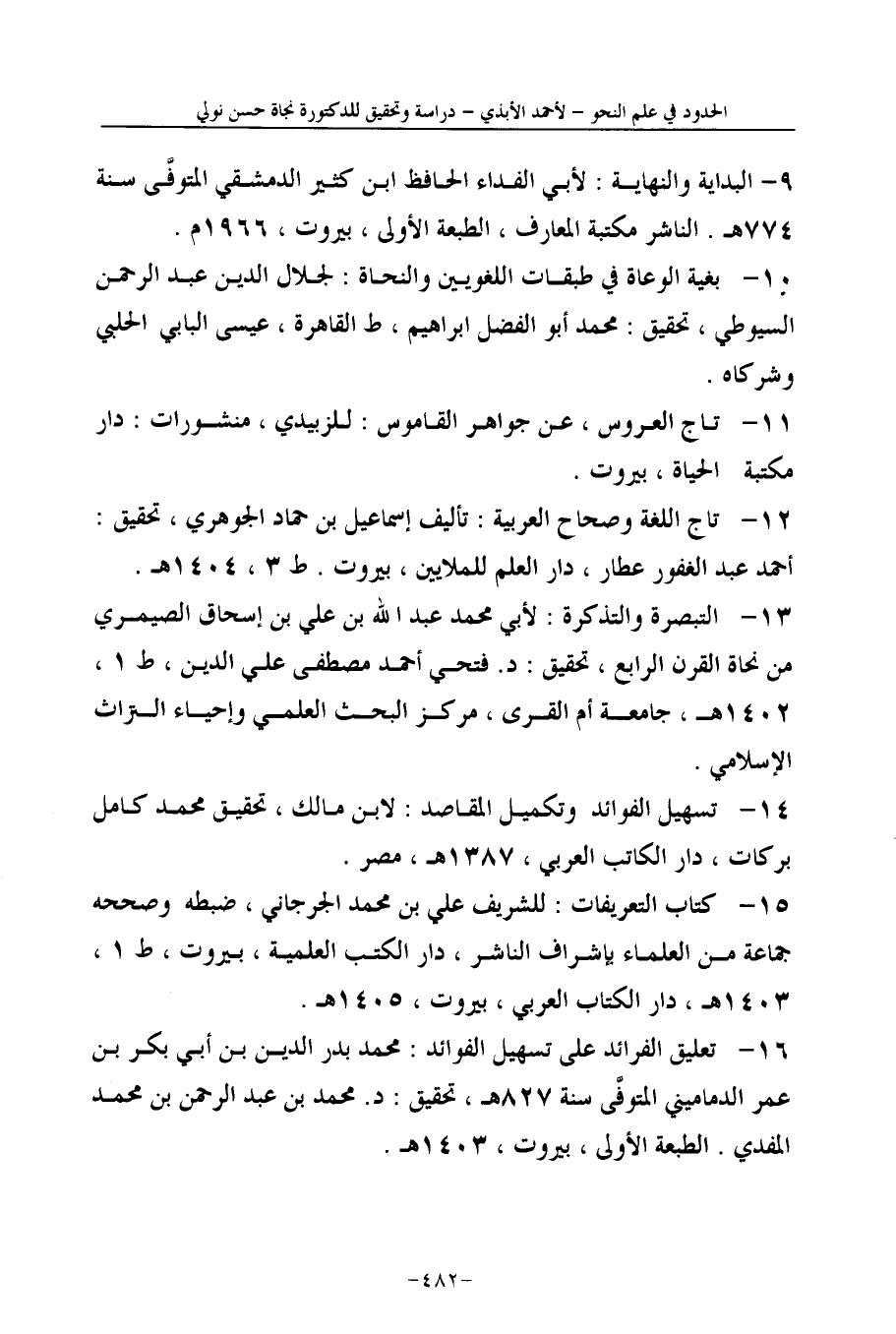 16- تعليق الفرائد على تسهيل الفوائد: محمد بدر الدين بن أبي بكر بن عمر الدماميني المتوفَّى سنة 827?، تحقيق: د. محمد بن عبد الرحمن بن محمد المفدي. الطبعة الأولى، بيروت، 1403هـ.