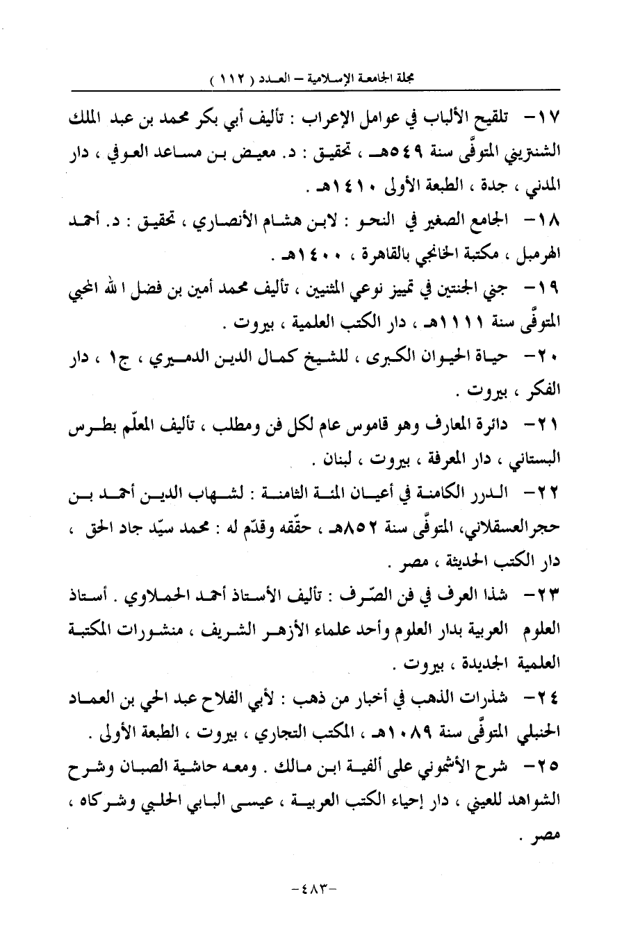 23- شذا العرف في فن الصّرف: تأليف الأستاذ أحمد الحملاوي. أستاذ العلوم العربية بدار العلوم وأحد علماء الأزهر الشريف، منشورات المكتبة العلمية الجديدة، بيروت.