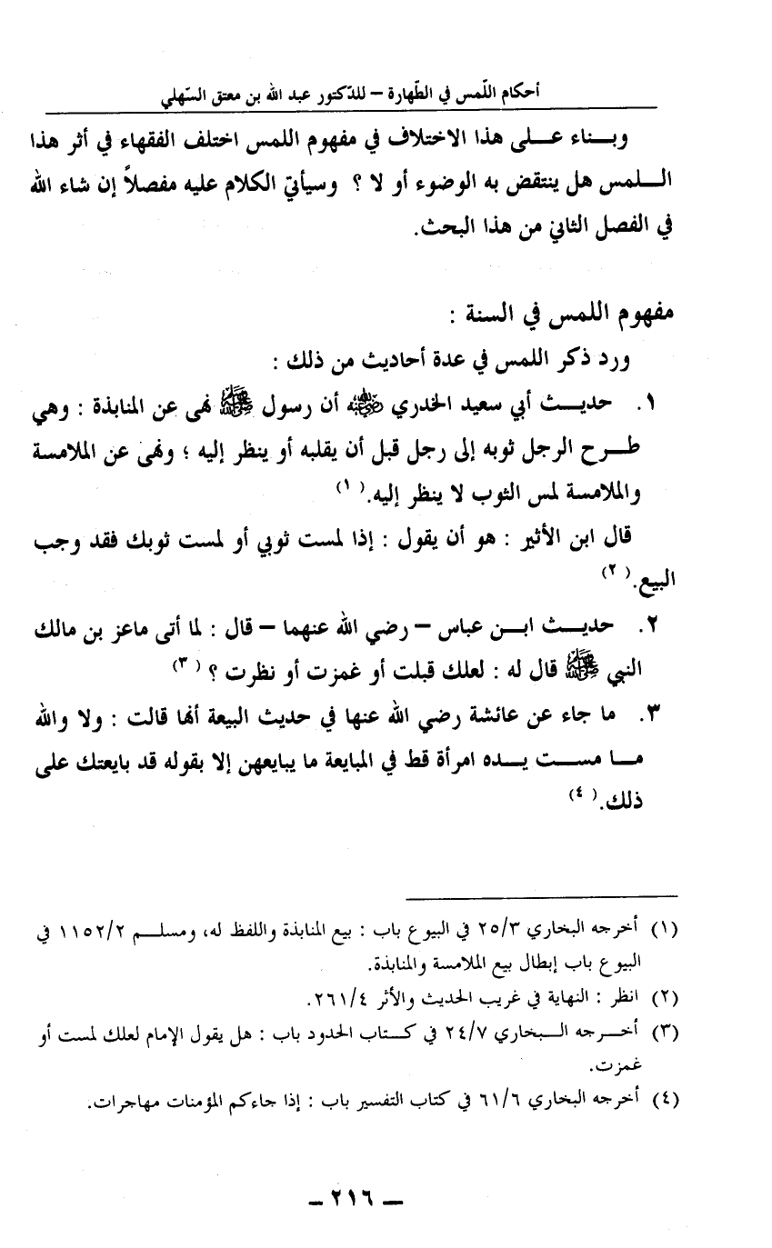 وبناء على هذا الاختلاف في مفهوم اللمس اختلف الفقهاء في أثر هذا اللمس هل ينتقض به الوضوء أو لا؟ وسيأتي الكلام عليه مفصلاً إن شاء الله في الفصل الثاني من هذا البحث.
