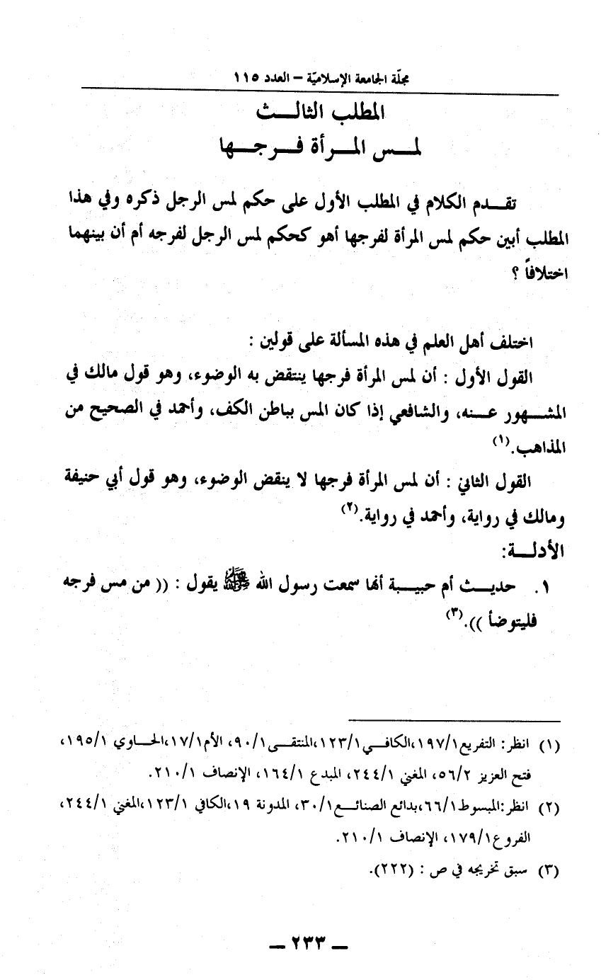 المطلب الثالث: في لمس المرأة فرجها