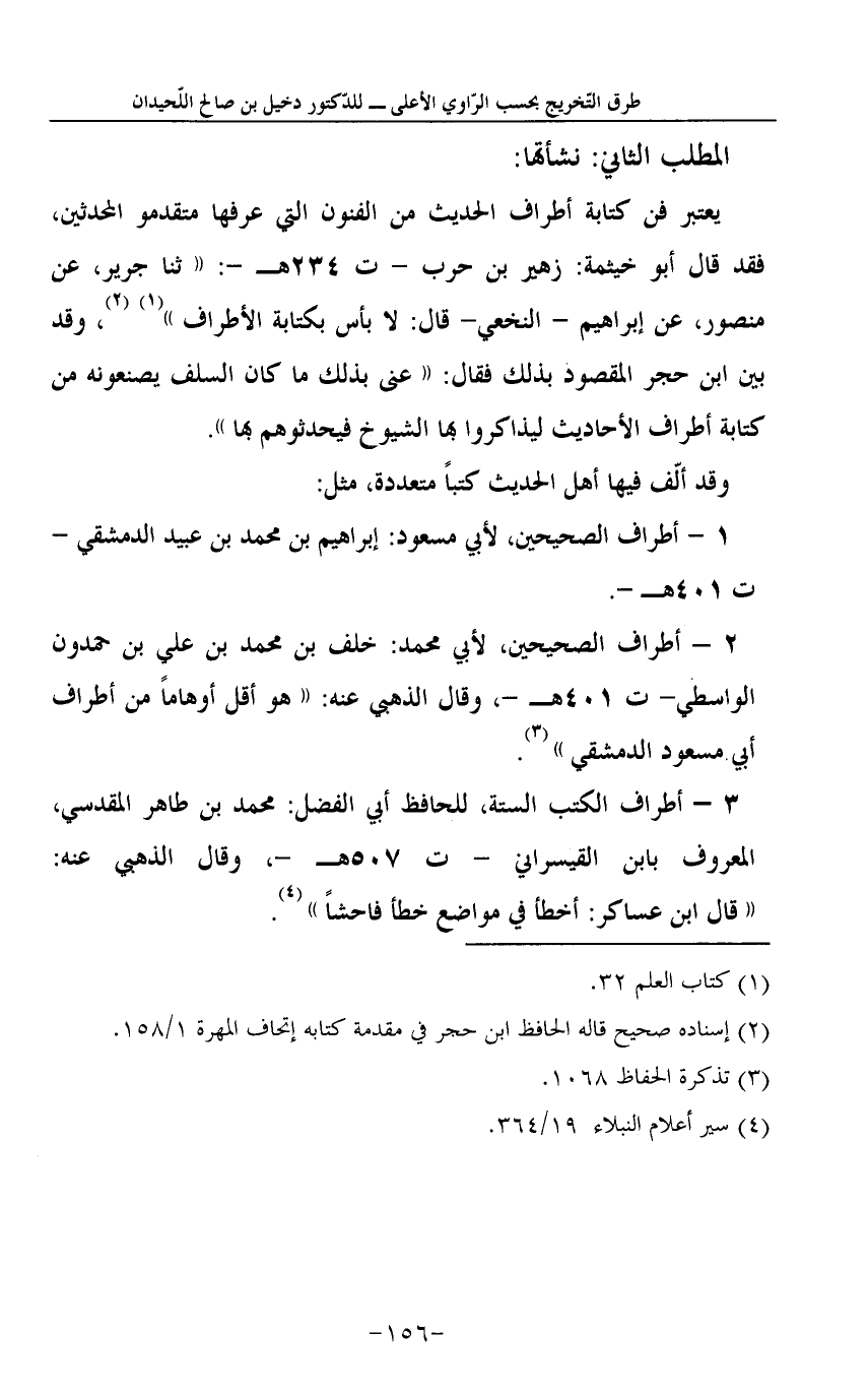 3 - أَطْرَاف الْكتب السِّتَّة، لِلْحَافِظِ أبي الْفضل: مُحَمَّد بن طَاهِر الْمَقْدِسِي، الْمَعْرُوف بِابْن القيسراني - ت 507هـ -، وَقَالَ الذَّهَبِيّ عَنهُ: "قَالَ ابْن عَسَاكِر: أَخطَأ فِي مَوَاضِع خطأ فَاحِشا"4.