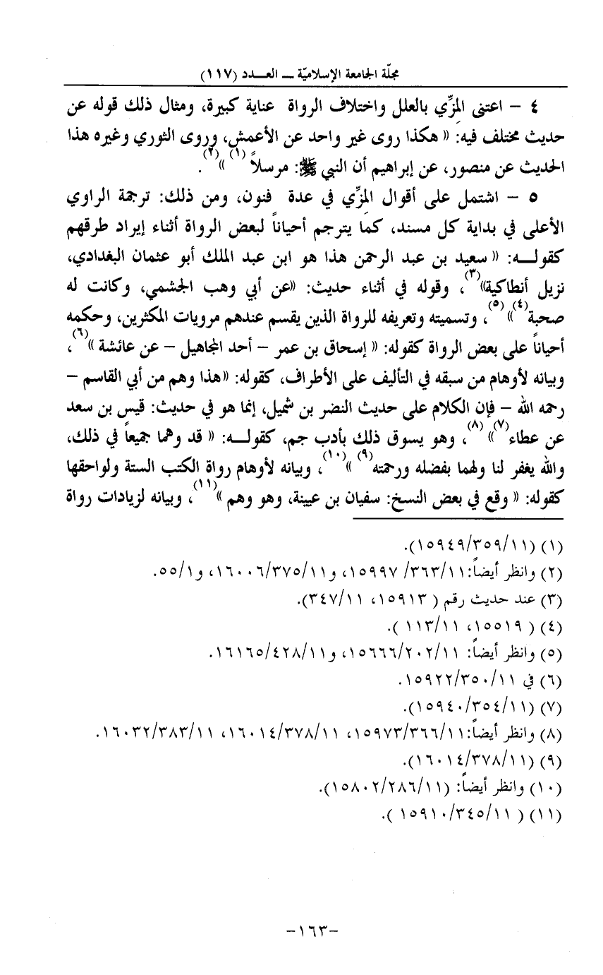 4 - اعتنى المِزِّي بالعلل وَاخْتِلَاف الروَاة عناية كَبِيرَة، وَمِثَال ذَلِك قَوْله عَن حَدِيث مُخْتَلف فِيهِ: "هَكَذَا روى غير وَاحِد عَن الْأَعْمَش، وروى الثَّوْريّ وَغَيره هَذَا الحَدِيث عَن مَنْصُور، عَن إِبْرَاهِيم أَن النَّبِي صلى الله عَلَيْهِ وَسلم: مُرْسلا 1"2.