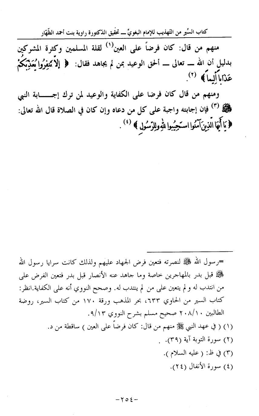 مِنْهُم من قَالَ: كَانَ فرضا على الْعين1 لقلَّة الْمُسلمين وَكَثْرَة الْمُشْركين بِدَلِيل أَن الله - تَعَالَى - ألحق الْوَعيد بِمن لم يُجَاهد فَقَالَ: {إلاّ تَنفِرُوا يُعَذِّبَكُمْ عَذَاباً ألِيماً} 2.