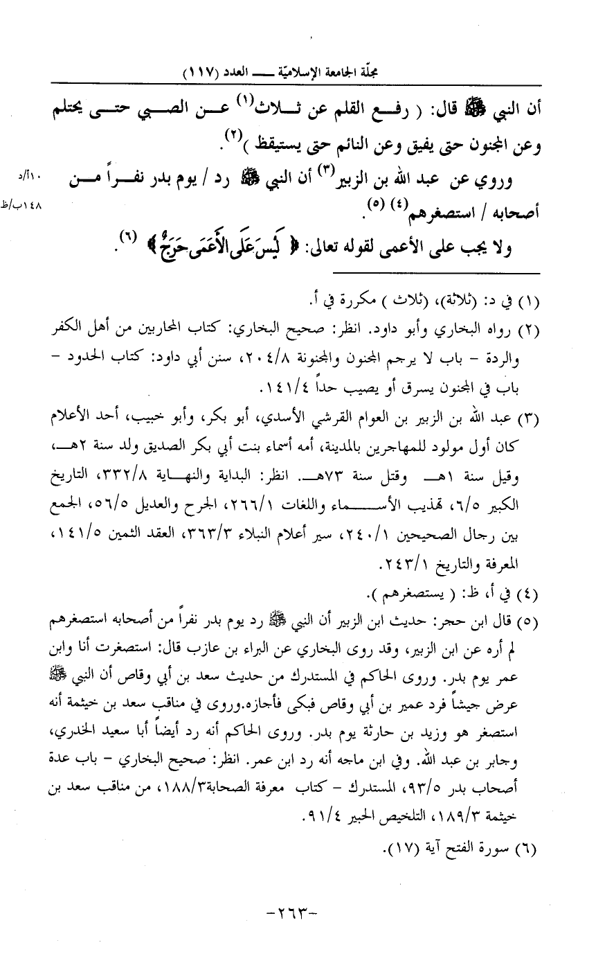 5 - قَالَ ابْن حجر: حَدِيث ابْن الزبير أَن النَّبِي صلى الله عَلَيْهِ وَسلم رد يَوْم بدر نَفرا من أَصْحَابه استصغرهم لم أره عَن ابْن الزبير، وَقد روى البُخَارِيّ عَن الْبَراء بن عَازِب قَالَ: استصغرت أَنا وَابْن عمر يَوْم بدر. وروى الْحَاكِم فِي الْمُسْتَدْرك من حَدِيث سعد بن أبي وَقاص أَن النَّبِي صلى الله عَلَيْهِ وَسلم عرض جَيْشًا فَرد عُمَيْر بن أبي وَقاص فَبكى فَأَجَازَهُ. وروى فِي مَنَاقِب سعد بن خَيْثَمَة أَنه استصغر هُوَ وَزيد بن حَارِثَة يَوْم بدر. وروى الْحَاكِم أَنه رد أَيْضا أَبَا سعيد الْخُدْرِيّ، وَجَابِر بن عبد الله. وَفِي ابْن مَاجَه أَنه رد ابْن عمر. انْظُر: صَحِيح البُخَارِيّ - بَاب عدَّة أَصْحَاب بدر 5/93، الْمُسْتَدْرك - كتاب معرفَة الصَّحَابَة3/188، من مَنَاقِب سعد بن خَيْثَمَة 3/189، التَّلْخِيص الحبير 4/91.