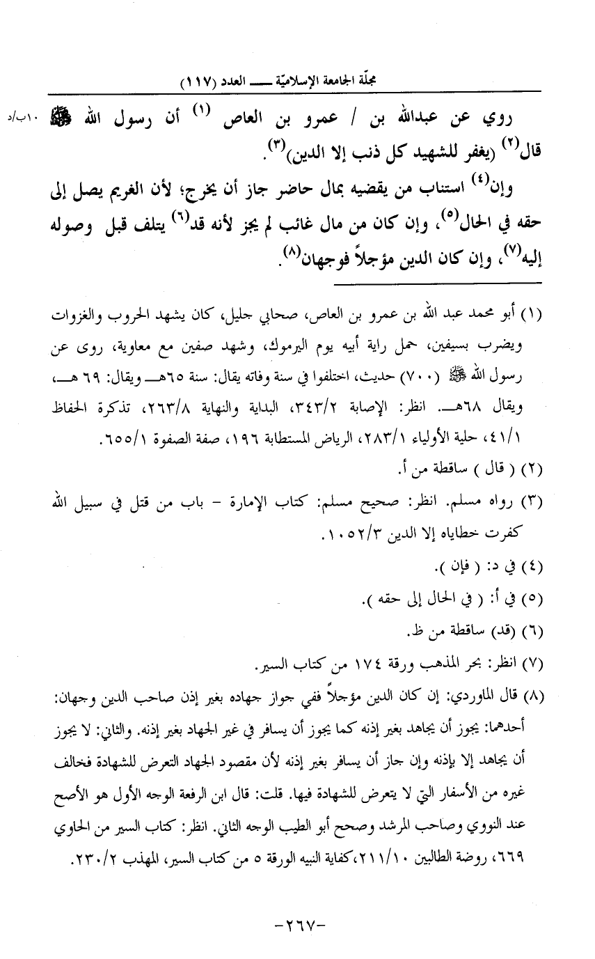 رُوِيَ عَن عبد الله بن عَمْرو بن الْعَاصِ 1 أَن رَسُول الله صلى الله عَلَيْهِ وَسلم قَالَ2: "يغْفر للشهيد كل ذَنْب إِلَّا الدّين"3.