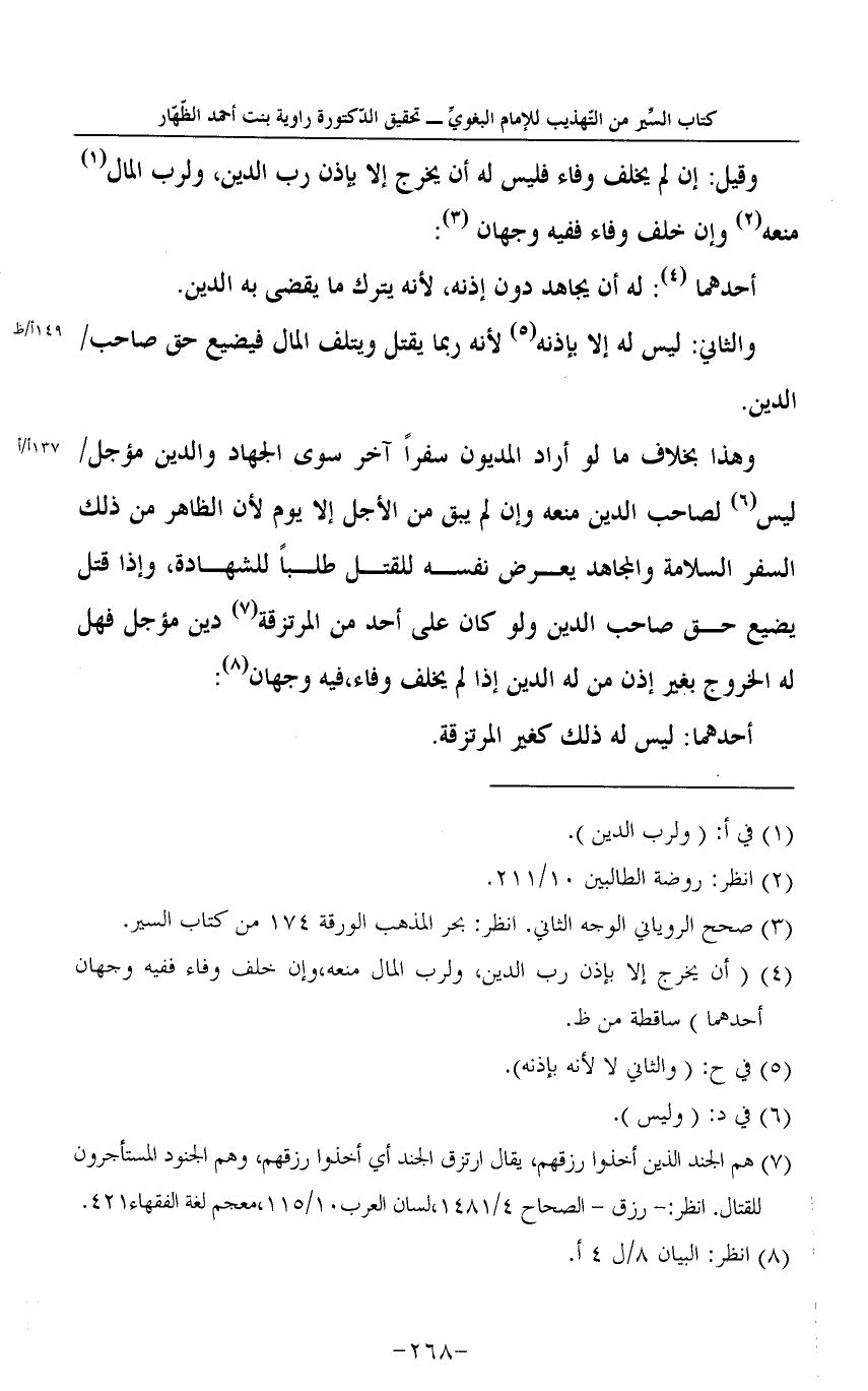 4 - (أَن يخرج إِلَّا بِإِذن رب الدّين، ولرب المَال مَنْفَعَة، وَإِن خلف وَفَاء فَفِيهِ وَجْهَان أَحدهمَا) سَاقِطَة من ظ.