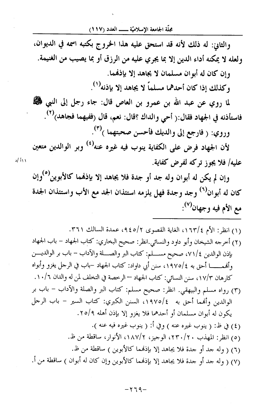 3 - رَوَاهُ مُسلم وَالْبَيْهَقِيّ. انْظُر: صَحِيح مُسلم: كتاب الْبر والصلة والآداب - بَاب بر الْوَالِدين وأنهما أَحَق بِهِ 4/1975، السّنَن الكبري: كتاب السّير - بَاب الرجل يكون لَهُ أَبَوَانِ مسلمان أَو أَحدهمَا فَلَا يَغْزُو إِلَّا بِإِذن أَهله 9/25.