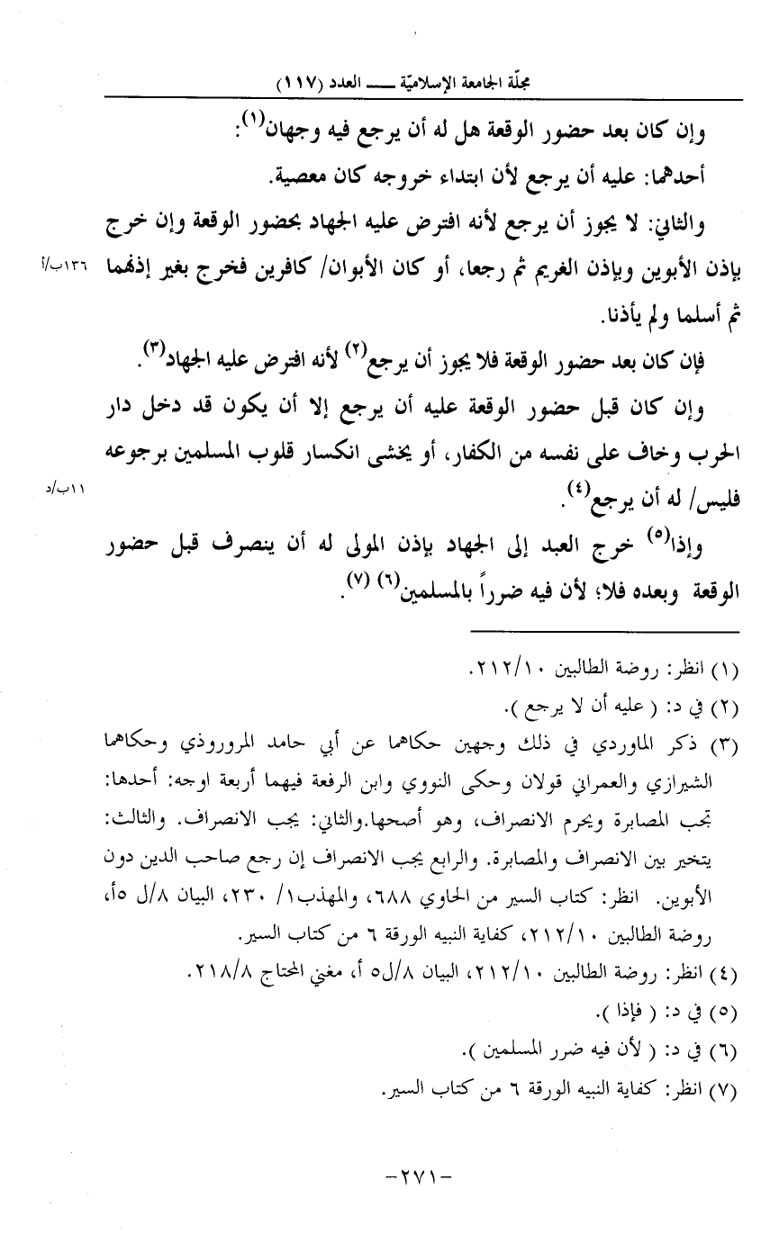 3 - ذكر الْمَاوَرْدِيّ فِي ذَلِك وَجْهَيْن حَكَاهُمَا عَن أبي حَامِد المروروذي وحكاهما الشِّيرَازِيّ والعمراني قَولَانِ وَحكى النَّوَوِيّ وَابْن الرّفْعَة فيهمَا أَرْبَعَة اوجه: أَحدهَا: تجب المصابرة وَيحرم الِانْصِرَاف، وَهُوَ أَصَحهَا. وَالثَّانِي: يجب الِانْصِرَاف. وَالثَّالِث: يتَخَيَّر بَين الِانْصِرَاف والمصابرة. وَالرَّابِع يجب الِانْصِرَاف إِن رَجَعَ صَاحب الدّين دون الْأَبَوَيْنِ. انْظُر: كتاب السّير من الْحَاوِي 688، والمهذب1/ 230، الْبَيَان 8/ل 5أ، رَوْضَة الطالبين 10/212، كِفَايَة النبيه الورقة 6 من كتاب السّير.