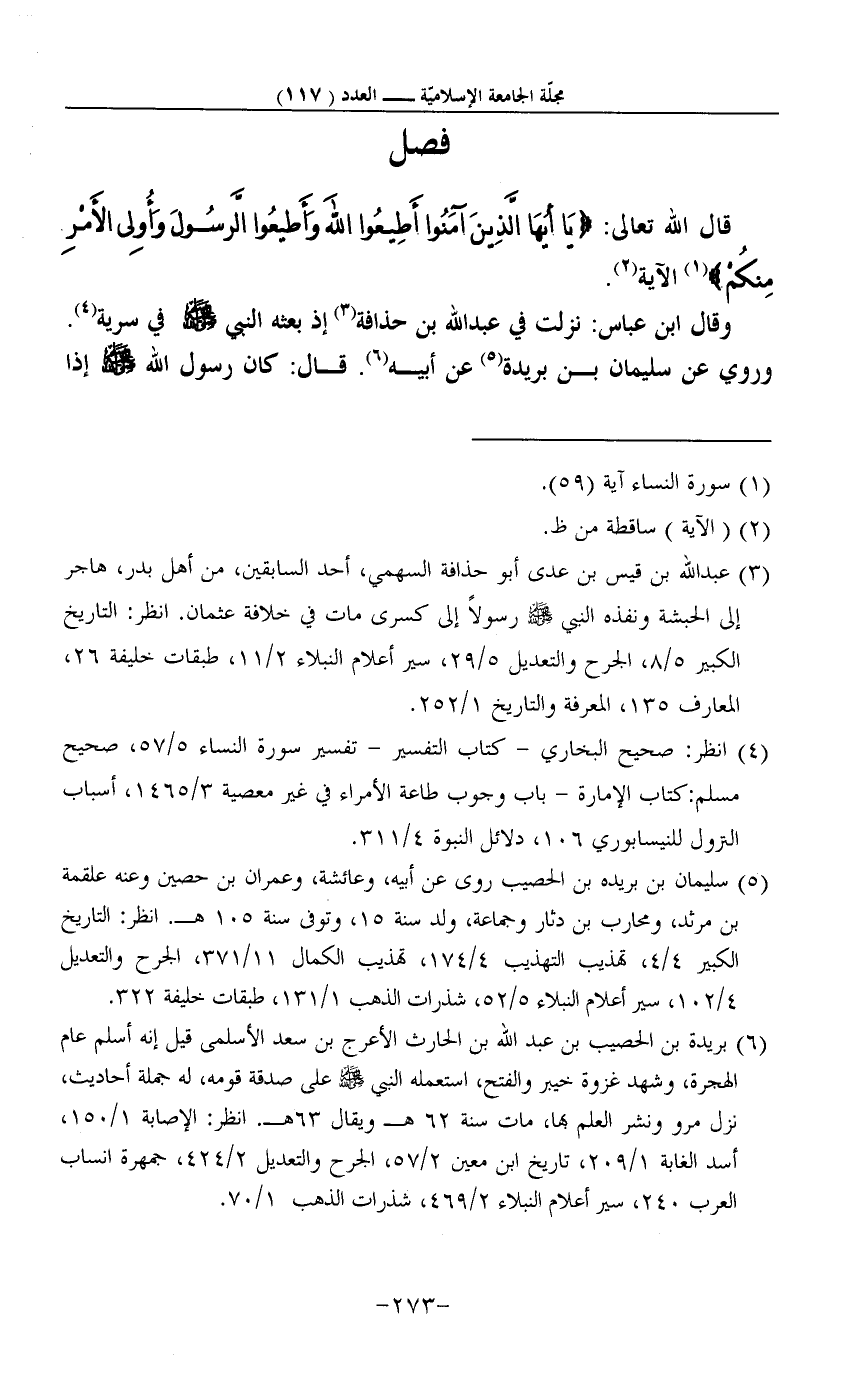 4 - انْظُر: صَحِيح البُخَارِيّ - كتاب التَّفْسِير - تَفْسِير سُورَة النِّسَاء 5/57، صَحِيح مُسلم: كتاب الْإِمَارَة - بَاب وجوب طَاعَة الْأُمَرَاء فِي غير مَعْصِيّة 3/1465، أَسبَاب النُّزُول للنيسابوري 106، دَلَائِل النُّبُوَّة 4/311.
